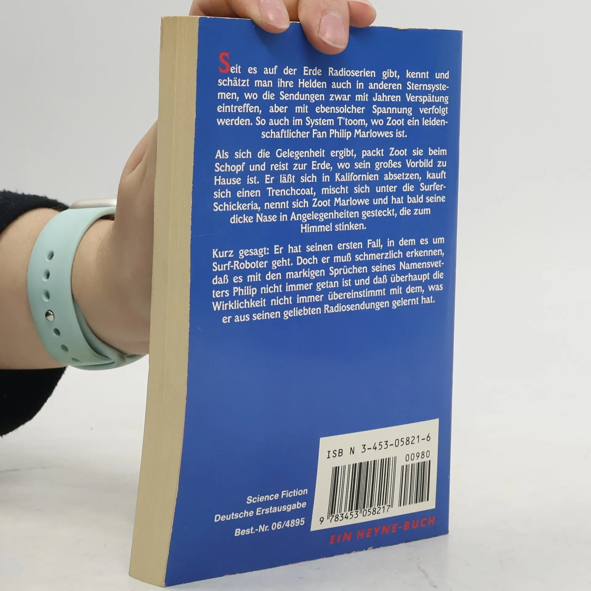 Seit es auf der Erde Radioserien gibt, kennt und schätzt man ihre Helden auch in anderen Sternsystemen, wo die Sendungen zwar mit Jahren Verspätung eintreffen, aber mit ebensolcher Spannung verfolgt werden. So auch im System T'toom, wo Zoot ein leidenschaftlicher Fan Philip Marlowes ist. Als sich die Gelegenheit ergibt, packt Zoot sie beim Schopf und reist zur Erde, wo sein großes Vorbild zu Hause ist. Er läßt sich in Kalifornien absetzen, kauft sich einen Trenchcoat, mischt sich unter die Surfer-Schickeria, nennt sich Zoot Marlowe und hat bald seine dicke Nase in Angelegenheiten gesteckt, die zum Himmel stinken. Kurz gesagt: Er hat seinen ersten Fall, in dem es um Surf-Roboter geht. Doch er muß schmerzlich erkennen, daß es mit den markigen Sprüchen seines Namensvetters Philip nicht immer getan ist und daß überhaupt die Wirklichkeit nicht immer übereinstimmt mit dem, was er aus seinen geliebten Radiosendungen gelernt hat. Science Fiction Deutsche Erstausgabe