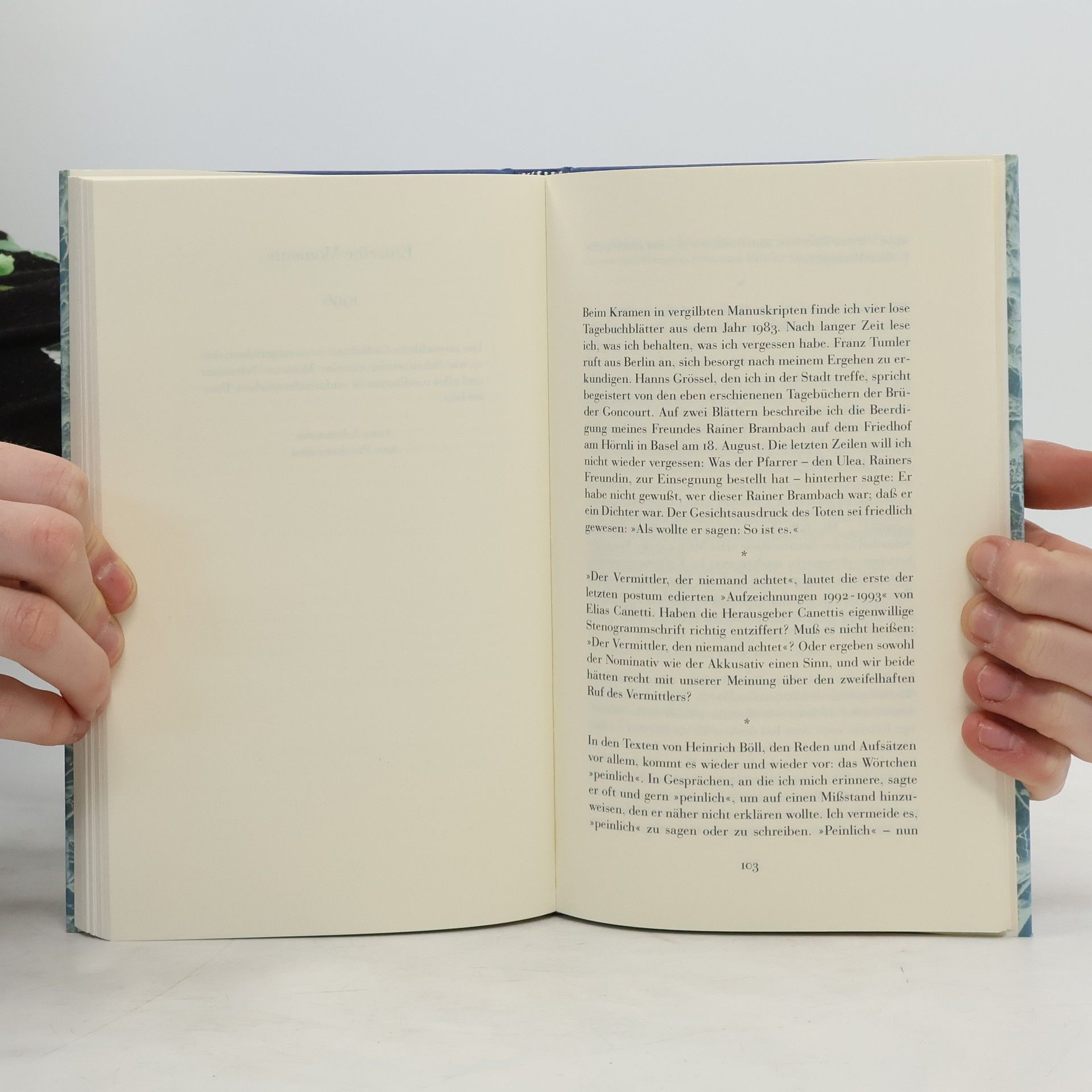 Hans Bender hat aus seinen täglichen Beobachtungen und Notizen ein Tagebuch eines Schriftstellers geschaffen, in dem sich Lebenslinien und Schreibprozesse kreuzen. Es enthält Gedanken, Erinnerungen und Begegnungen sowie Notizen zu Kollegen wie Elias Canetti und Manès Sperber.