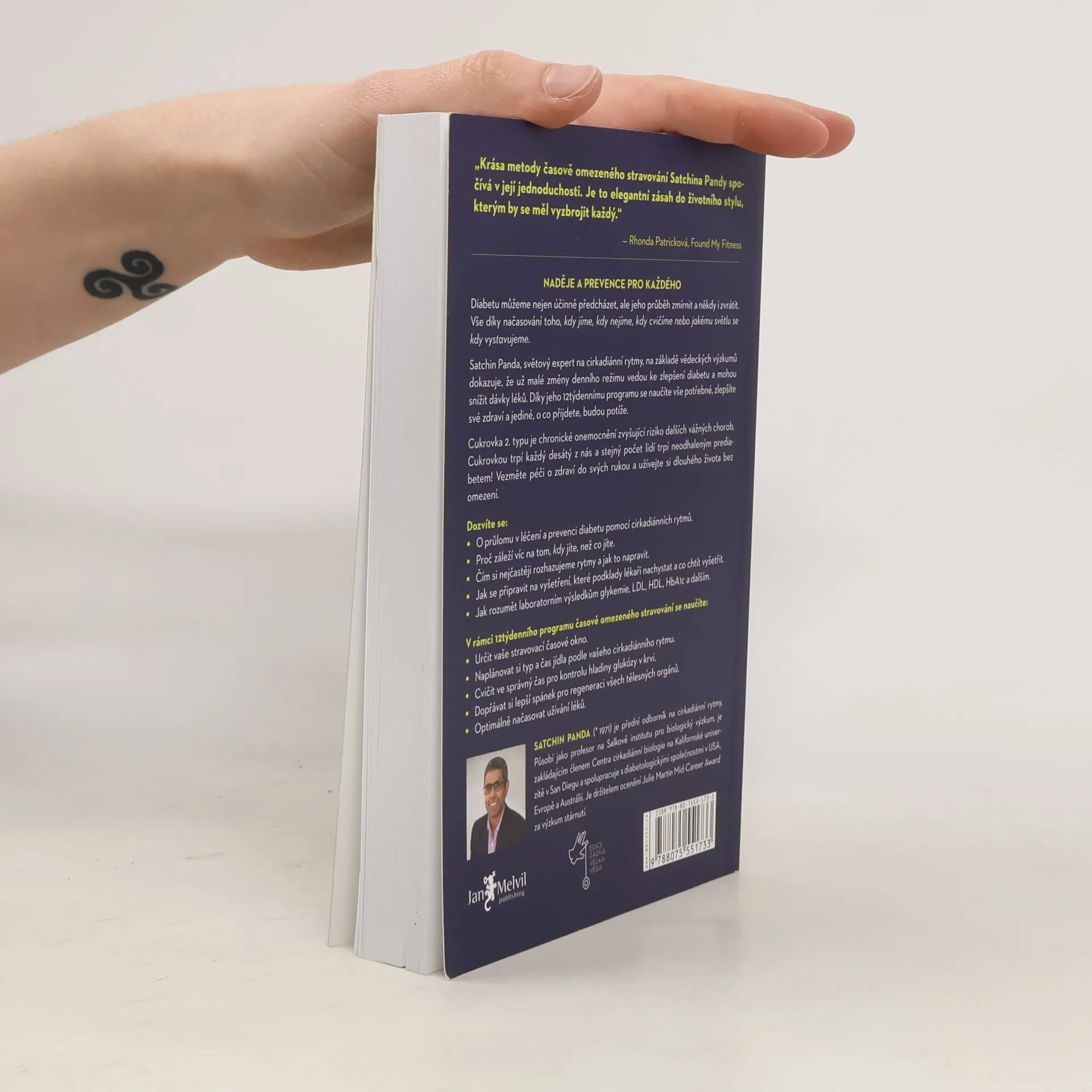 Světová autorita ve výzkumu cirkardiánních rytmů Satchin Panda i výsledky dalších vědeckých studií dokazují, že jednoduchý režim, který vyladí váš každodenní životní styl - kdy jíte, kdy spíte, kdy cvičíte a také kdy a jakému se vystavujeme světlu - s přirozeným cirkadiánním rytmem těla, může být stejně účinný v boji proti cukrovce, jako současně dostupné léky. Navíc bez vedlejších účinků. A nejlepší na tom je, že dodržování 12týdenního programu, který ve své knize autor představuje, zlepší také všechny ostatní aspekty vašeho zdraví, od zhubnutí až po posílení imunity.Přehledně a srozumitelně zjistíte, jak sestavit denní režim přizpůsobený svému tělu na míru i jak si osvojit přerušovaný půst. Tato jednoduchá opatření optimalizují hladinu glukózy v krvi a také přirozeně snižují riziko vzniku srdečních onemocnění a obezity.