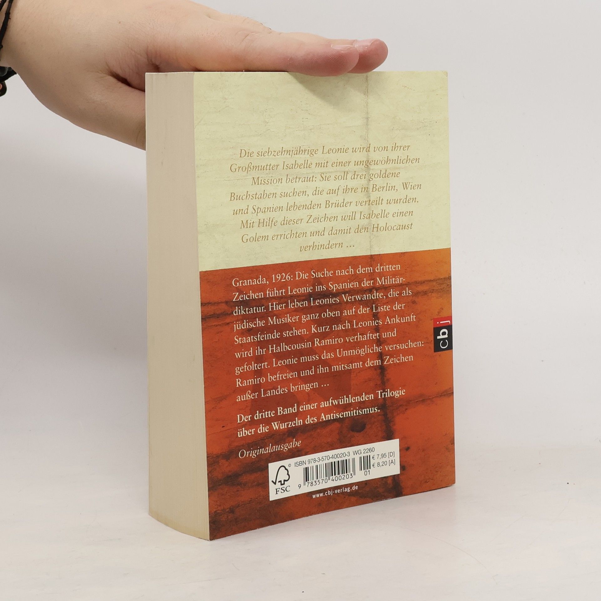 Eine mitreißende Trilogie über Antisemitismus, in der die siebzehnjährige Leonie Lasker von ihrer Großmutter Isabelle beauftragt wird, drei goldene Buchstaben zu finden, um einen Golem zu erschaffen und den Holocaust zu verhindern. Ihre Suche führt sie ins Spanien der Militärdiktatur, wo sie ihren Halbcousin Ramiro befreien muss.