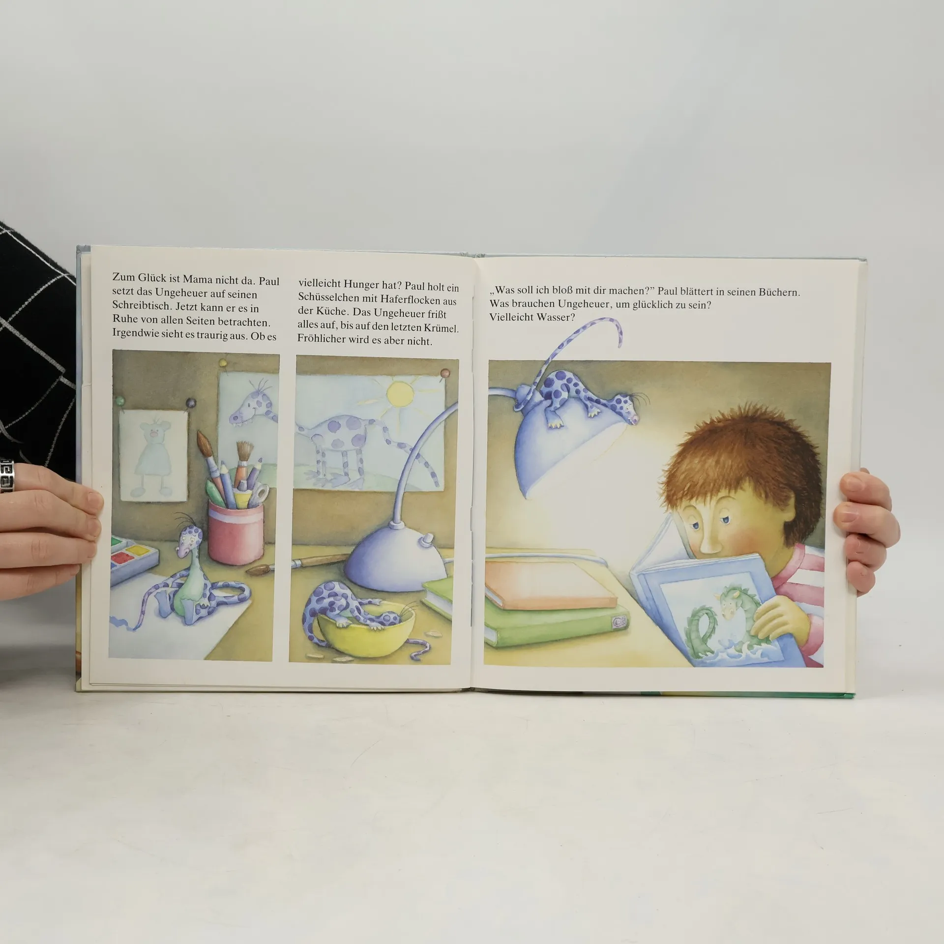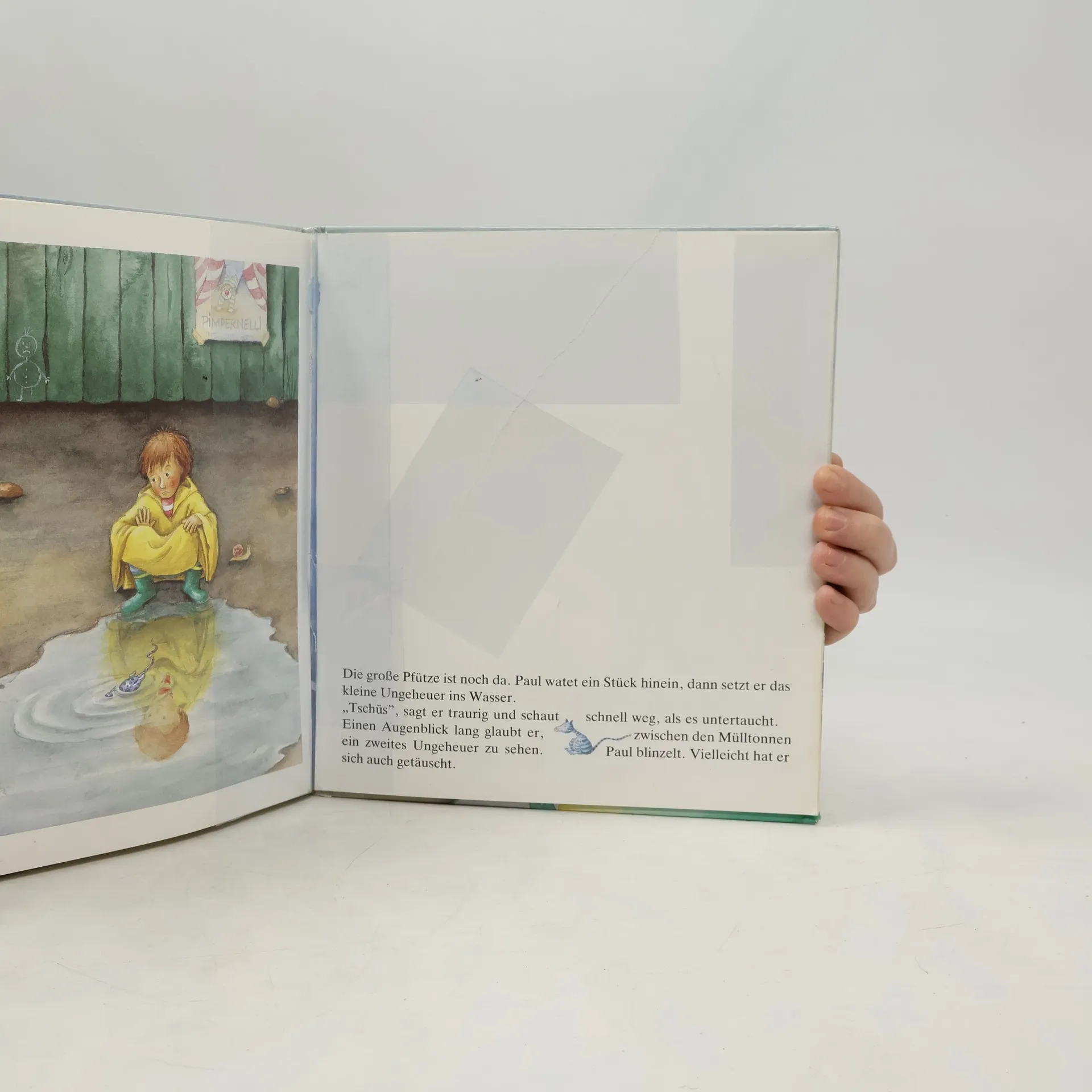 Paul hat ein blauviolettes Ungeheuer gefangen, mit dem er gerne spielt. Doch das Ungeheuer scheint unglücklich zu sein. Vermisst es vielleicht seine Pfütze?