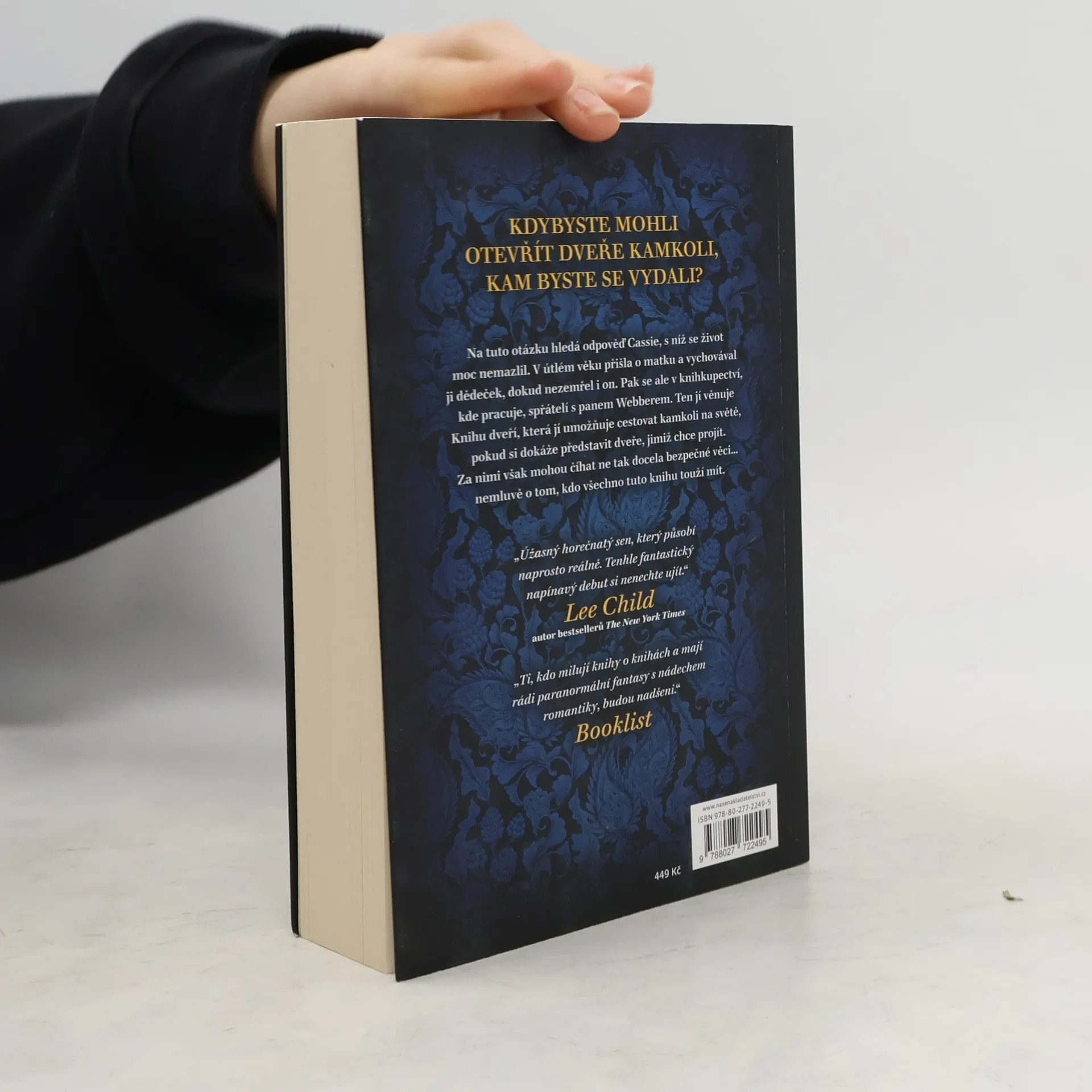 Fantasy román, v němž hlavní hrdinka Cassie získá magickou Knihu dveří, která jí umožní cestovat kamkoli na světě, pokud si dokáže představit dveře, jimiž tam chce projít. To s sebou sice přináší mnohá dobrodružství, ale i velké nebezpečí. Cassie Andrewsová pracuje v knihkupectví v New Yorku a žije nenápadným, obyčejným životem. Až do dne, kdy jeden z jejích oblíbených zákazníků - osamělý, ale okouzlující starý pán - v její blízkosti zemře a zanechá jí dar. Je to kniha - neobyčejná kniha, plná podivných textů a záhadných kreseb. A na první stránce je ručně psaný vzkaz pro Cassie, kde se píše, že je to Kniha dveří a že každé dveře mohou být jakékoli dveře. Cassie záhy objeví, že Kniha dveří je speciální kniha, která svému majiteli propůjčuje neobvyklé schopnosti. Brzy začne zkoumat, co všechno Kniha dveří dokáže. Kniha dveří však není jedinou magickou knihou na světě. Existují i jiné knihy, které dokážou úžasné, ale i strašlivé věci, když je použijí nebezpeční a nemilosrdní jedinci, kteří ze všeho nejvíc touží po tom, co teď vlastní Cassie, a jsou ochotní pro to vraždit. Nakladatelská anotace. Kráceno.