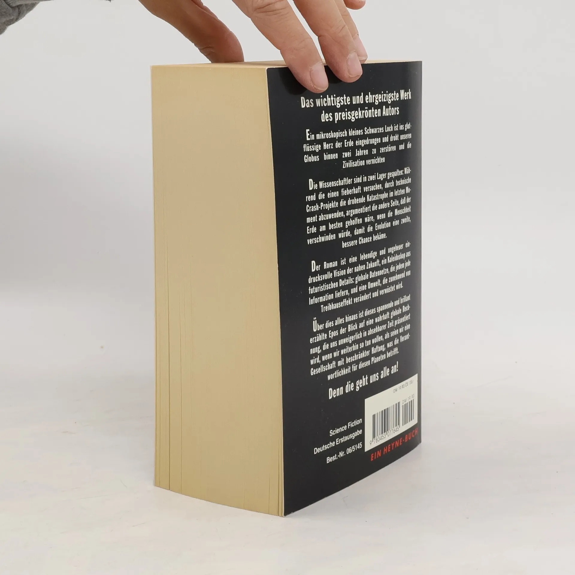 Das wichtigste und ehrgeizigste Werk des preisgekrönten Autors Ein mikroskopisch kleines Schwarzes Loch ist ins glutflüssige Herz der Erde eingedrungen und droht unseren Globus binnen zwei Jahren zu zerstören und die Zivilisation zu vernichten. Die Wissenschaftler sind in zwei Lager gespalten: Während die einen fieberhaft versuchen, durch technische Crash-Projekte die drohende Katastrophe im letzten moment abzuwenden, argumentiert die andere Seite, daß der Erde am besten geholfen wäre, wenn die Menschheit verschwinden würde, damit die Evolution eine zweite, bessere Chance bekäme. Der Roman ist eine lebendige und ungeheuer eindrucksvolle Vision der nahen Zukunft, ein Kaleidoskop aus futuristischen Details; globale Datennetze, die jedem jede Information liefern, und eine Umwelt, die zunehmend vom Treibhauseffekt verändert und verwüstet wird. Über dies alles hinaus ist dieses spannende und brillant erzählte Epos der Blick auf eine wahrhaft globale Rechnung, die uns unweigerlich in absehbarer Zeit präsentiert wird, wenn wir weiterhin so tun wollen, als seien wir eine Gesellschaft mit beschränkter Haftung, was die Verantwortlichkeit für diesen Planeten betrifft. Denn die geht uns alle an! Heyne 06/5145