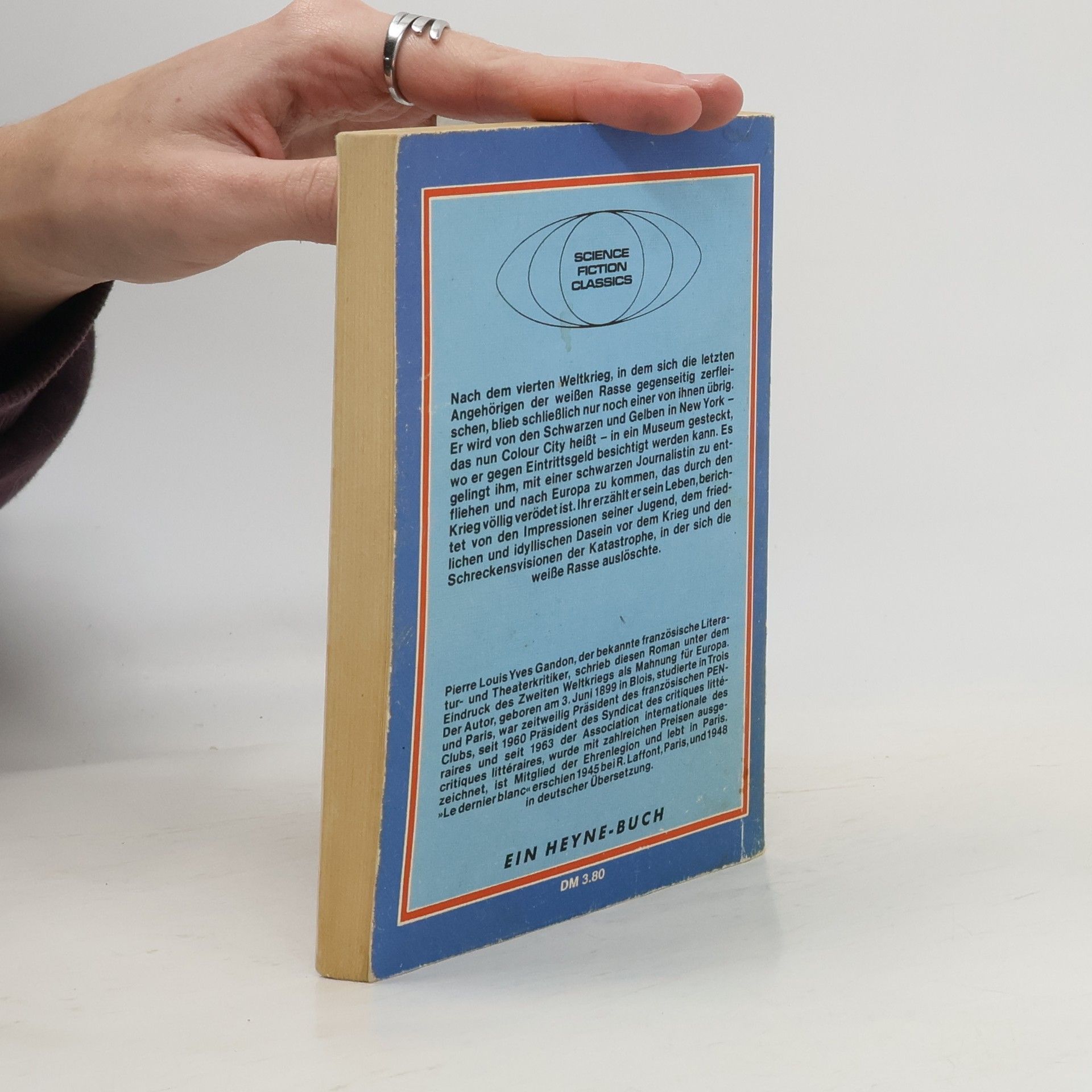 Nach dem vierten Weltkrieg, in dem sich die letzten Angehörigen der weißen Rasse gegenseitig zerfleischen, blieb schließlich nur noch einer von ihnen übrig. Er wird von den Schwarzen und Gelben in New York – das nun Colour City heißt – in ein Museum gesteckt, wo er gegen Eintrittsgeld besichtigt werden kann. Es gelingt ihm, mit einer schwarzen Journalistin zu entfliehen und nach Europa zu kommen, das durch den Krieg völlig verödet ist. Ihr erzählt er sein Leben, berichtet von den Impressionen seiner Jugend, dem friedlichen und idyllischen Dasein vor dem Krieg und den Schreckensvisionen der Katastrophe, in der sich die weiße Rasse auslöschte. Pierre Louis Yves Gandon, der bekannte französische Literatur- und Theaterkritiker, schrieb diesen Roman unter dem Eindruck des Zweiten Weltkriegs als Mahnung für Europa. Der Autor, geboren am 3. Juni 1899 in Blois, studierte in Trois und Paris, war zeitweilig Präsident des französischen PEN-Clubs, seit 1960 Präsident des Syndicat des critiques litteraires und seit 1963 der Association internationale des critiques litteraires, wurde mit zahlreichen Preisen ausgezeichnet, ist Mitglied der Ehrenlegion und lebt in Paris. »Le dernier blanc« erschien 1945 bei R. Laffont, Paris, und 1948 in deutscher Übersetzung.
