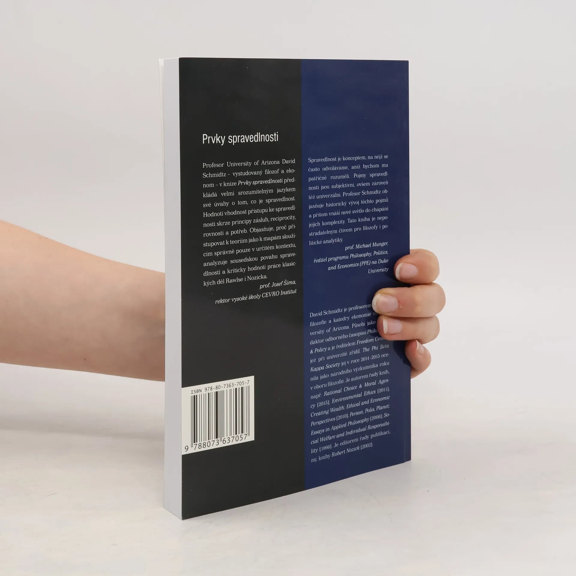 Profesor University of Arizona David Schmidtz – vystudovaný filosof a ekonom – v knize Prvky spravedlnosti předkládá velmi srozumitelným jazykem své úvahy o tom, co je spravedlnost. Hodnotí vhodnost přístupu ke spravedlnosti skrze principy zásluh, reciprocity, rovnosti a potřeb. Objasňuje, proč přistupovat k teoriím jako k mapám sloužícím správně pouze v určitém kontextu, analyzuje sousedskou povahu spravedlnosti a kriticky hodnotí práce klasických děl Rawlse i Nozicka.