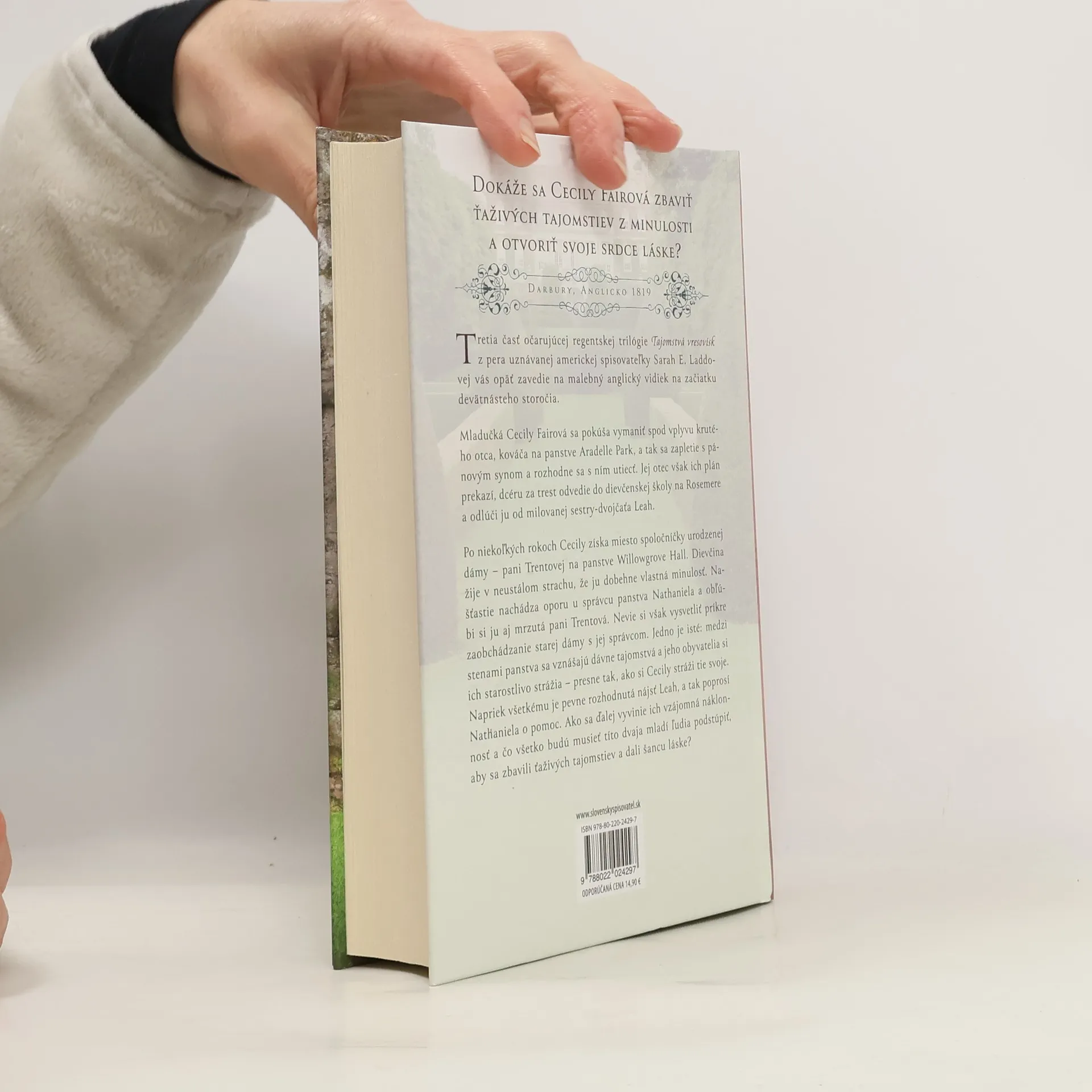 Tretia časť očarujúcej regentskej trilógie Tajomstvá vresovísk z pera uznávanej americkej spisovateľky Sarah E. Laddovej vás opäť zavedie na malebný anglický vidiek na začiatku devätnásteho storočia.Mladučká Cecily Fairová sa pokúša vymaniť spod vplyvu krutého otca, kováča na panstve Aradelle Park, a tak sa zapletie s pánovým synom a rozhodne sa s ním utiecť. Jej otec však ich plán prekazí, dcéru za trest odvedie do dievčenskej školy na Rosemere a odlúči ju od milovanej sestry-dvojčaťa Leah.Po niekoľkých rokoch Cecily získa miesto spoločníčky urodzenej dámy – pani Trentovej na panstve Willowgrove Hall. Dievčina žije v neustálom strachu, že ju dobehne vlastná minulosť. Našťastie nachádza oporu u správcu panstva Nathaniela a obľúbi si ju aj mrzutá pani Trentová. Nevie si však vysvetliť príkre zaobchádzanie starej dámy s jej správcom. Jedno je isté: medzi stenami panstva sa vznášajú dávne tajomstvá a jeho obyvatelia si ich starostlivo strážia – presne tak, ako si Cecily stráži tie svoje. Napriek všetkému je pevne rozhodnutá nájsť Leah, a tak poprosí Nathaniela o pomoc. Ako sa ďalej vyvinie ich vzájomná náklonnosť a čo všetko budú musieť títo dvaja mladí ľudia podstúpiť, aby sa zbavili ťaživých tajomstiev a dali šancu láske?
