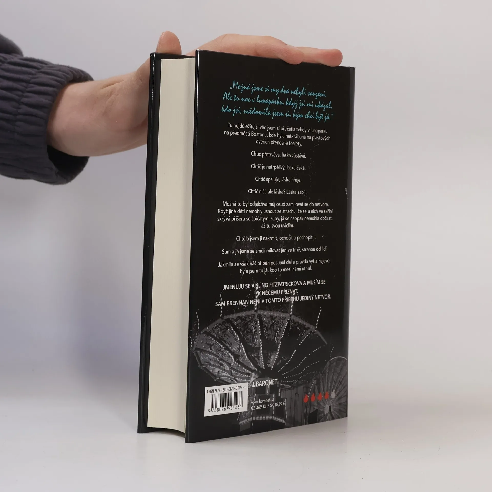 Chtíč ničí, ale láska… ta zabíjí. Erotický román od královny žhavých příběhů. Tu nejdůležitější věc jsem si přečetla tehdy v lunaparku na předměstí Bostonu, kde byla naškrábaná na plastových dveřích přenosné toalety. Chtíč přetrvává, láska zůstává. Chtíč je netrpělivý, láska čeká. Chtíč spaluje, láska hřeje. Chtíč ničí, ale láska? Láska zabíjí. Možná to byl odjakživa můj osud zamilovat se do netvora. Když jiné děti nemohly usnout ze strachu, že se u nich ve skříni skrývá příšera se špičatými zuby, já se naopak nemohla dočkat, až tu svou uvidím. Chtěla jsem ji nakrmit, ochočit a pochopit ji. Sam a já jsme se směli milovat jen ve tmě, stranou od lidí. Jakmile se však náš příběh posunul dál a pravda vyšla najevo, byla jsem to já, kdo to mezi námi utnul. Jmenuju se Aisling Fitzpatricková a musím se k něčemu přiznat. Sam Brennan není v tomto příběhu jediný netvor.