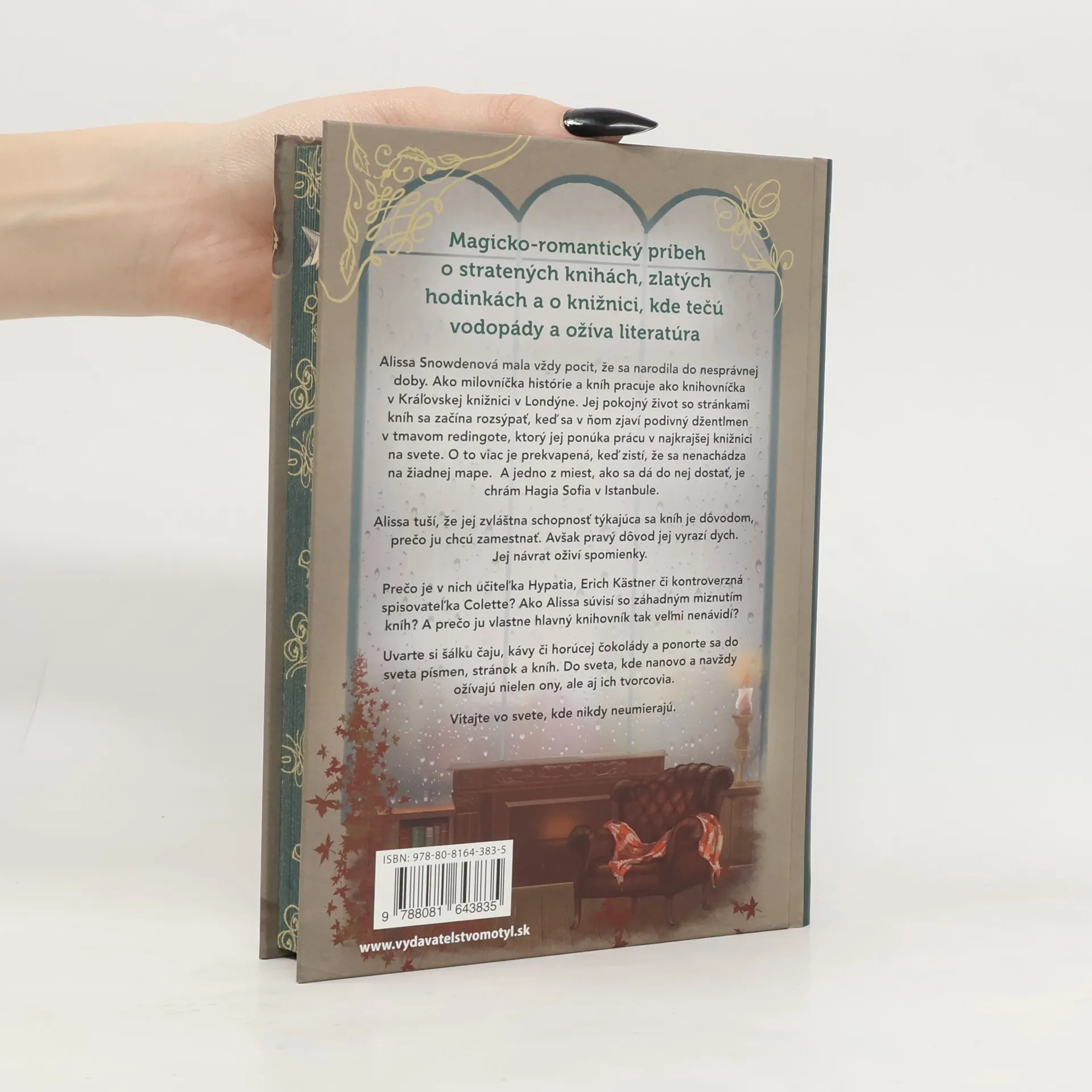 Alissa Snowdenová mala vždy pocit, že sa narodila do nesprávnej doby. Ako milovníčka histórie a kníh pracuje ako knihovníčka v Kráľovskej knižnici v Londýne. Jej pokojný život so stránkami kníh sa začína rozsýpať, keď sa v ňom zjaví podivný džentlmen v tmavom redingote, ktorý jej ponúka prácu v najkrajšej knižnici na svete. O to viac je prekvapená, keď zistí, že sa nenachádza na žiadnej mape. A jedno z miest, ako sa dá do nej dostať, je chrám Hagia Sofia v Istanbule. Alissa tuší, že jej zvláštna schopnosť týkajúca sa kníh je dôvodom, prečo ju chcú zamestnať. Avšak pravý dôvod jej vyrazí dych. Jej návrat oživí spomienky. Prečo je v nich učiteľka Hypatia, Erich Kästner či kontroverzná spisovateľ ka Colette? Ako Alissa súvisí so záhadným miznutím kníh? A prečo ju vlastne hlavný knihovník tak veľmi nenávidí? Uvarte si šálku čaju, kávy či horúcej čokolády a ponorte sa do sveta písmen, stránok a kníh. Do sveta, kde nanovo a navždy ožívajú nielen ony, ale aj ich tvorcovia. Vitajte vo svete, kde nikdy neumierajú.