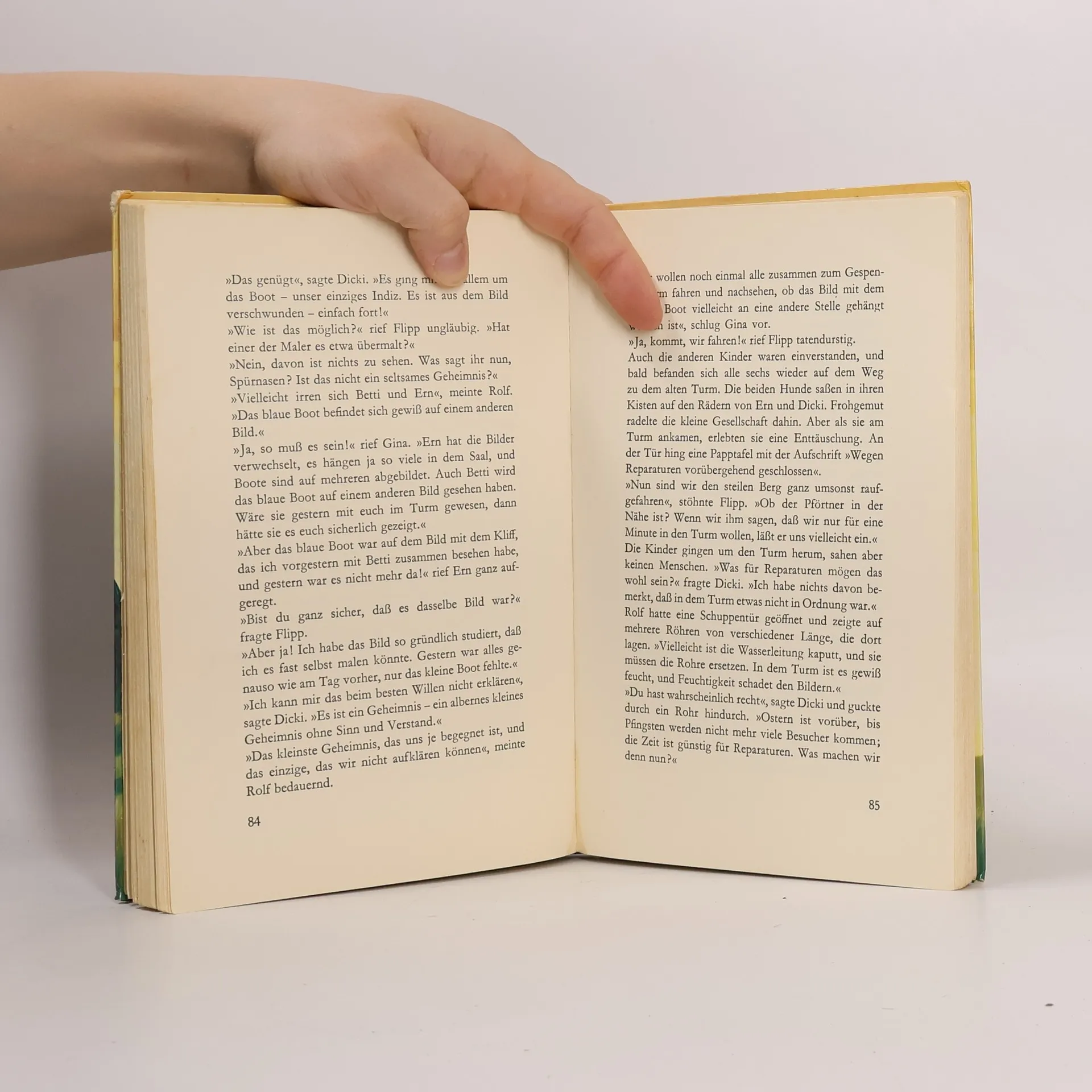 Diesmal besuchen die Spürnasen Betti, Gina, Rolf und Flipp mit ihrem Anführer Dicki einen alten Turm, in dem es spuken soll. Ern hat einen drolligen Hund mitgebracht, der Dickis Scotchterrier alles nachmacht. In dem Gespensterturm haben die Kinder ein unheimliches Erlebnis. Und wie rätselhaft erscheint ihnen die Sache mit dem blauen Boot! Aber sie lassen sich nicht verwirren und ruhen nicht eher, bis das Geheimnis aufgeklärt ist.
