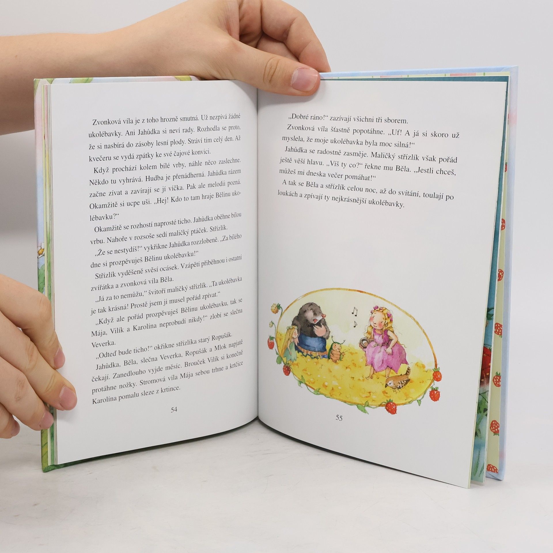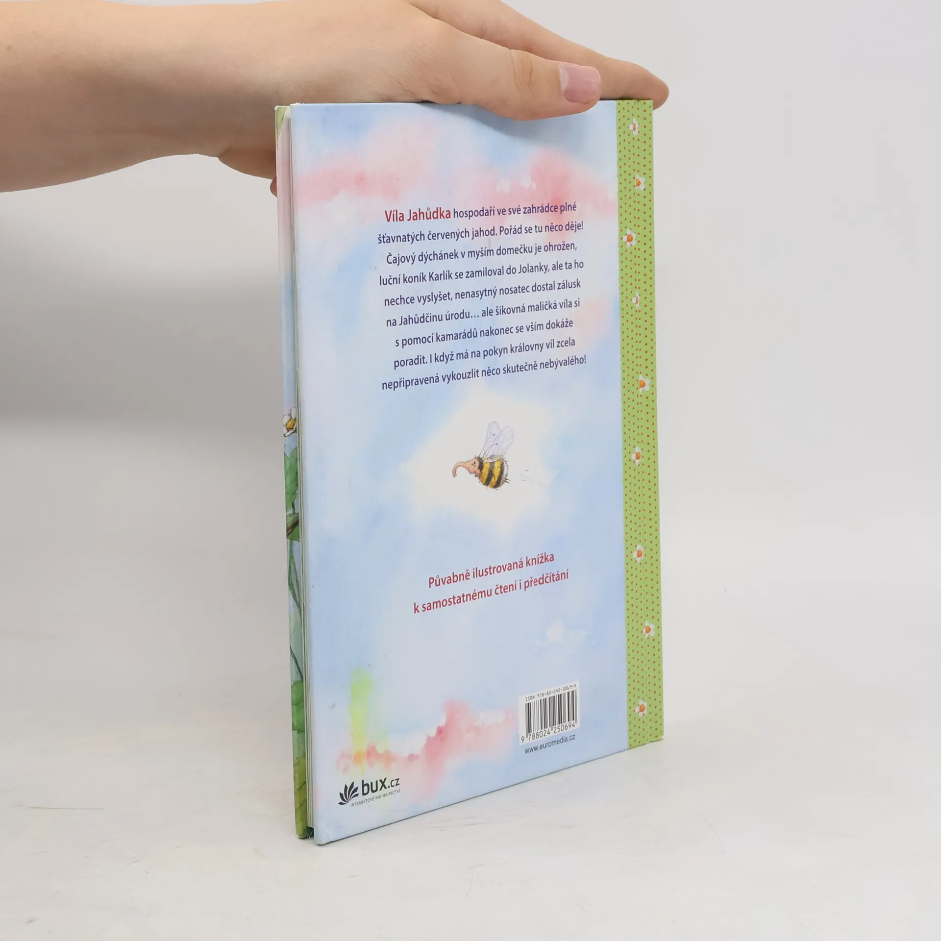 V jahodové zahrádce víly Jahůdky se pořád něco děje, a nejen tam – naštěstí si šikovná vílí holčička vždycky ví rady, ať už je potřeba vyléčit nachlazenou kamarádku, potěšit zoufalého ježka Zdeňka, podomácku vyrobit mimozemšťany nebo se vypořádat s nenasytným zlodějským nosatcem. Další z řady půvabně ilustrovaných knížek s tříminutovými pohádkami k samostatnému čtení či předčítání na dobrou noc.