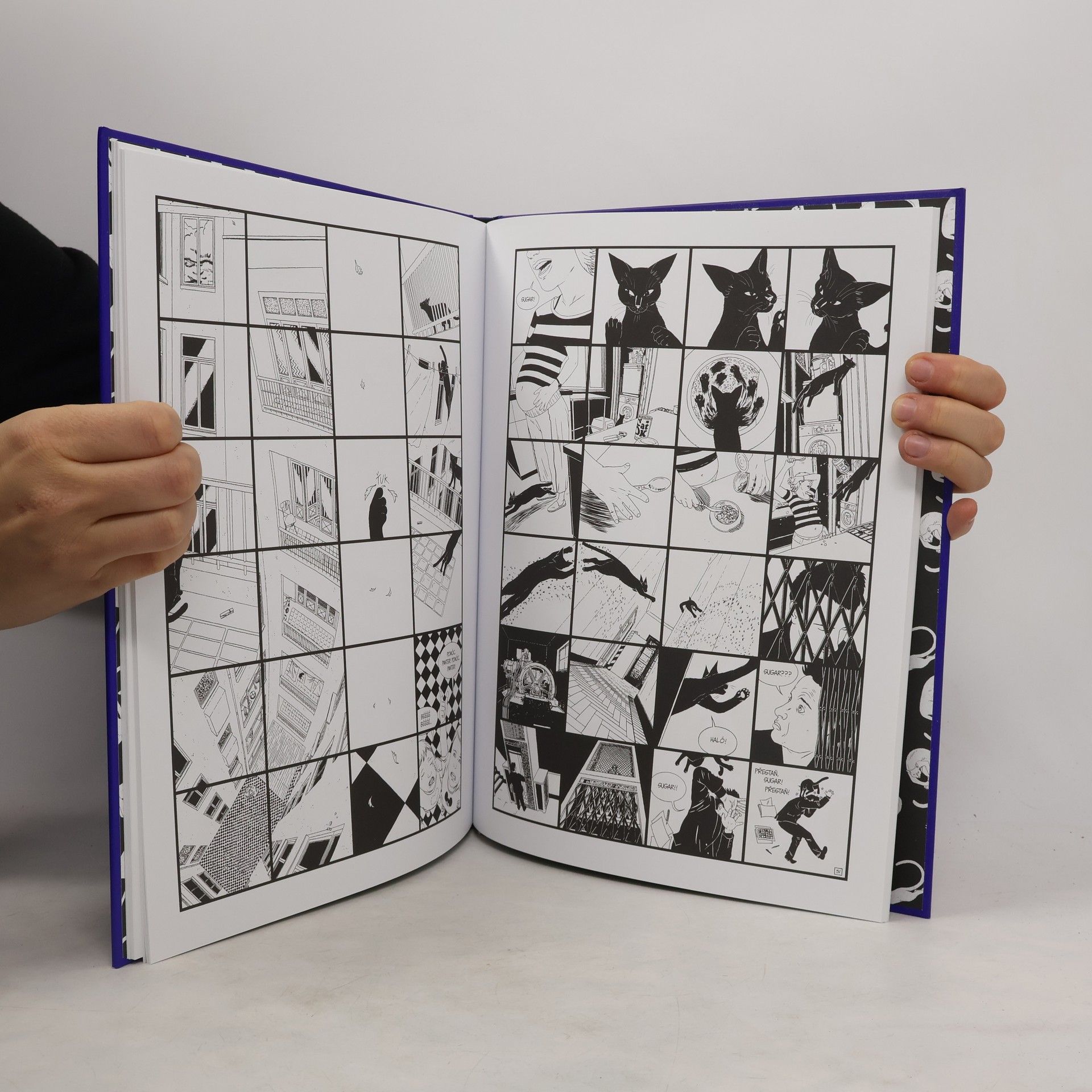 Svět se prý dělí na dva typy lidí. Ty, kteří mají rádi psy, a ty, kteří milují kočky. Vlámský autor Serge Baeken bezpochyby spadá do druhé kategorie. Na osmdesáti stranách vypráví autobiografický hravý příběh o svém životě s kočkami. Tim, Jeff, Maya, Rikki, to jsou jména jen několika z nich. Jako ústřední hrdinu svého komiksu si ovšem Baeken zvolil černého kocoura Sugar, který ho životem doprovázel po celých osmnáct let. V propojené síti černobílých oken sleduje jeho každodenní svět. Sugar běhá, hraje si nebo chytá mouchy, zatímco se v pozadí odehrává až na výjimky poklidný rodinný život.
