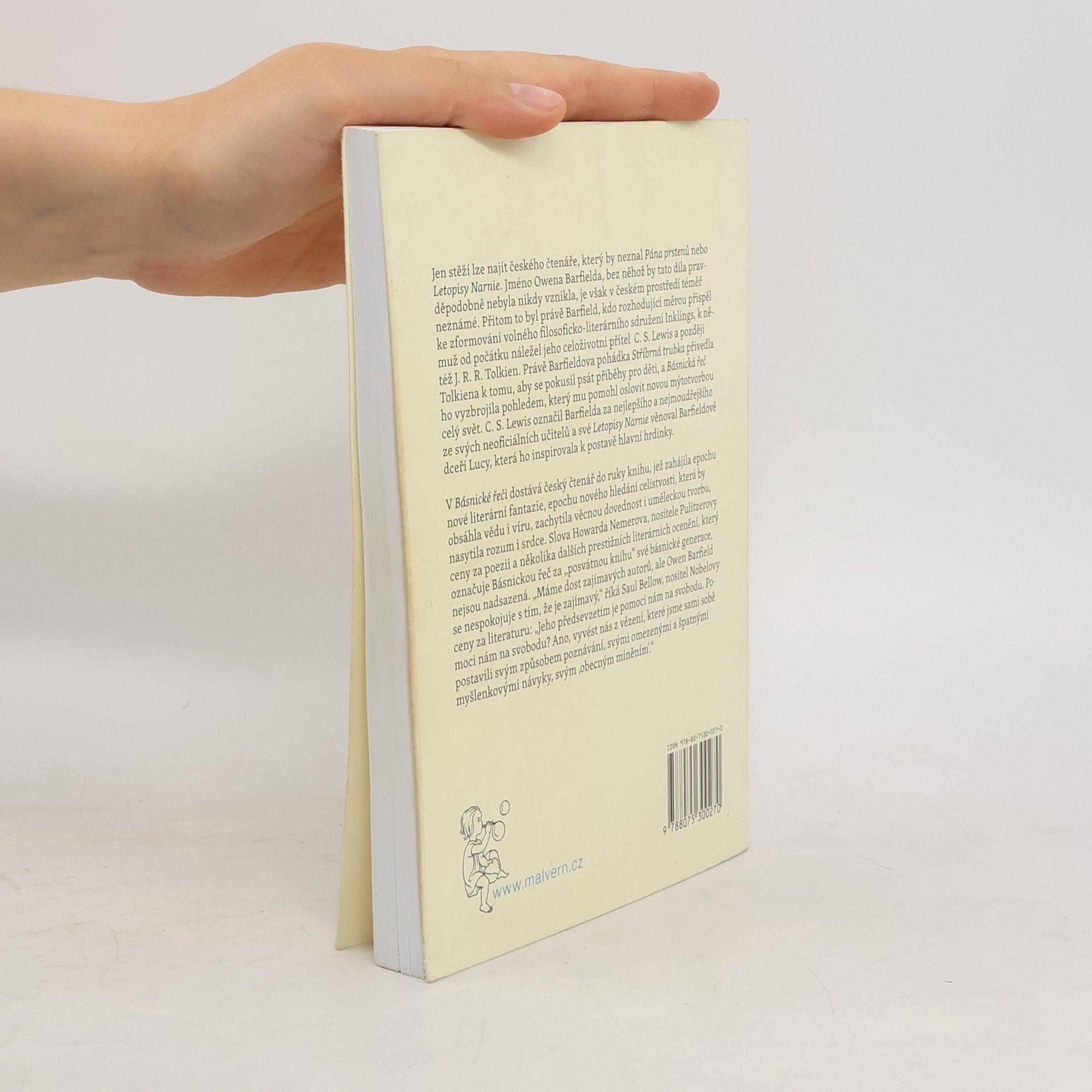 Jen stěží lze najít českého čtenáře, který by neznal Pána prstenů nebo Letopisy Narnie. Jméno Owena Barfielda, bez něhož by tato díla pravděpodobně nebyla nikdy vznikla, je však v českém prostředí téměř neznámé. Přitom to byl právě Barfield, kdo rozhodující měrou přispěl ke zformování volného filosoficko-literárního sdružení Inklings, k němuž od počátku náležel jeho celoživotní přítel C. S. Lewis a později též J. R. R. Tolkien. Právě Barfieldova pohádka Stříbrná trubka přivedla Tolkiena k tomu, aby se pokusil psát příběhy pro děti, a Básnická řeč ho vyzbrojila pohledem, který mu pomohl oslovit novou mýtotvorbou celý svět. C. S. Lewis označil Barfielda za nejlepšího a nejmoudřejšího ze svých neoficiálních učitelů a své Letopisy Narnie věnoval Barfieldově dceři Lucy, která ho inspirovala k postavě hlavní hrdinky. V Básnické řeči dostává český čtenář do ruky knihu, jež zahájila epochu nové literární fantazie, epochu nového hledání celistvosti, která by obsáhla vědu i víru, zachytila věcnou dovednost i uměleckou tvorbu, nasytila rozum i srdce. Slova Howarda Nemerova, nositele Pulitzerovy ceny za poezii a několika dalších prestižních literárních ocenění, který označuje Básnickou řeč za „posvátnou knihu“ své básnické generace, nejsou nadsazená. „Máme dost zajímavých autorů, ale Owen Barfield se nespokojuje s tím, že je zajímavý,“ říká Saul Bellow, nositel Nobelovy ceny za literaturu: „Jeho předsevzetím je pomoci nám na svobodu."