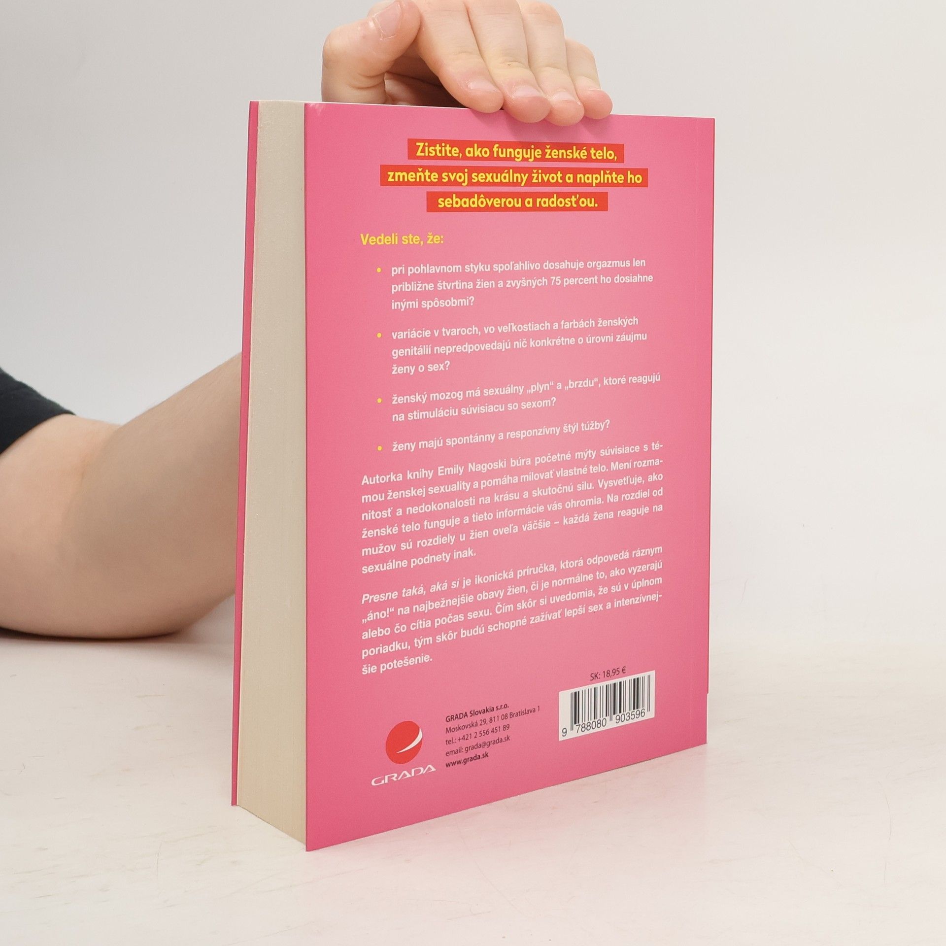 Zistite, ako funguje ženské telo, zmeňte svoj sexuálny život a naplňte ho sebadôverou a radosťou. Vedeli ste, že:• pri pohlavnom styku spoľahlivo dosahuje orgazmus len približne štvrtina žien a zvyšných 75 percent ho dosiahne inými spôsobmi?• variácie v tvaroch, vo veľkostiach a farbách ženských genitálií nepredpovedajú nič konkrétne o úrovni záujmu ženy o sex?• ženský mozog má sexuálny „plyn“ a „brzdu“, ktoré reagujú na stimuláciu súvisiacu so sexom?• ženy majú spontánny a responzívny štýl túžby?Autorka knihy Emily Nagoski búra početné mýty súvisiace s témou ženskej sexuality a pomáha milovať vlastné telo. Mení rozmanitosť a nedokonalosti na krásu a skutočnú silu. Vysvetľuje, ako ženské telo funguje a tieto informácie vás ohromia. Na rozdiel od mužov sú rozdiely u žien oveľa väčšie – každá žena reaguje na sexuálne podnety inak. „Presne taká, aká si“ je ikonická príručka, ktorá odpovedá ráznym „áno!“ na najbežnejšie obavy žien, či je normálne to, ako vyzerajú alebo čo cítia počas sexu. Čím skôr si uvedomia, že sú v úplnom poriadku, tým skôr budú schopné zažívať lepší sex a intenzívnejšie potešenie.