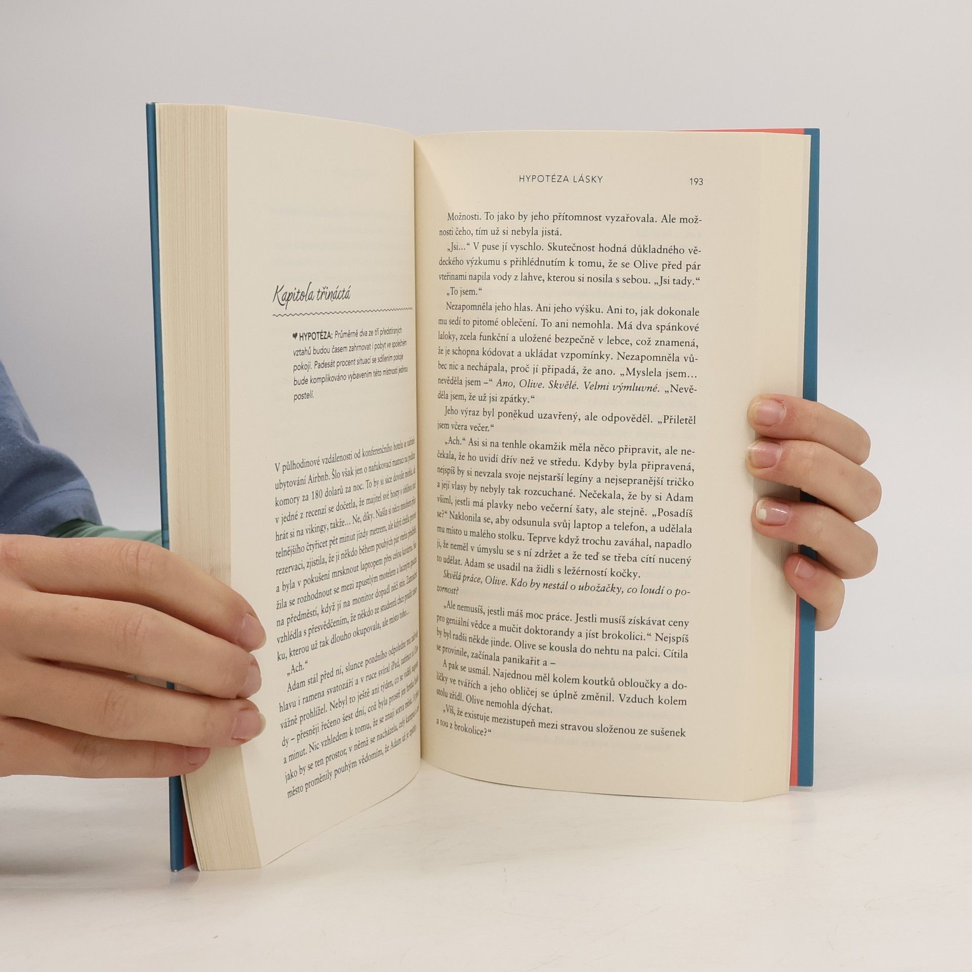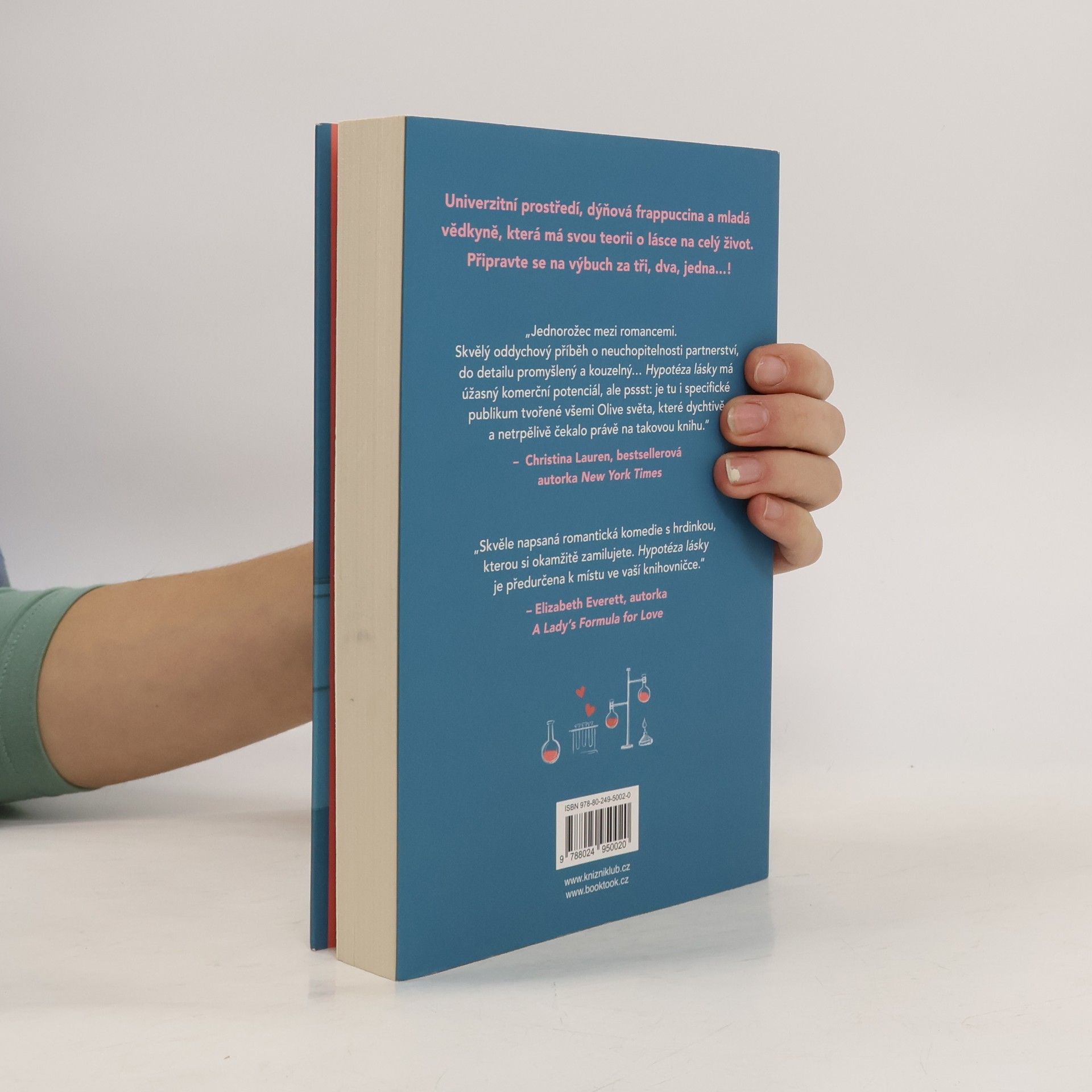 Romantická komedie, která zbořila sociální sítě! Olive je doktorandka na Stanfordu. Na trvalé romantické vztahy příliš nevěří, zato její nejlepší kamarádka ano. Takže pokud ji chce přesvědčit, že s někým randí a její milostný život nabral správný směr, musí na to jít chytře. Vědci totiž potřebují důkazy. Proto Olive, jako každá jiná sebevědomá bioložka, zpanikaří a políbí prvního muže, na kterého narazí – Adama Carlsena. Mladý, v oboru uznávaný profesor má pověst přísného školitele. Byl tak jejich polibek největší chybou, kterou Olive v životě udělala, nebo se tohle setkání může vyvinout v něco víc? Kniha obsahuje také bonusovou kapitolu.