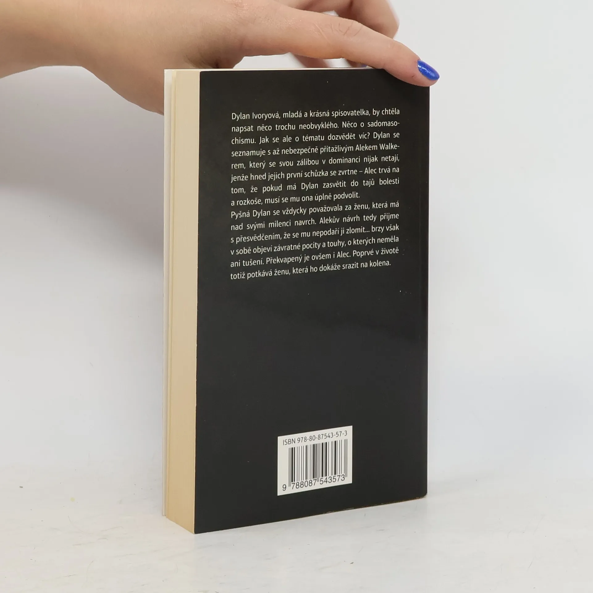 Dylan Ivoryová, mladá a krásná spisovatelka, by chtěla napsat něco trochu neobvyklého. Něco o sadomasochismu. Jak se ale o tématu dozvědět víc? Dylan se seznamuje s až nebezpečně přitažlivým Alekem Walkerem, který se svou zálibou v dominanci nijak netají, jenže hned jejich první schůzka se zvrtne - Alec trvá na tom, že pokud má Dylan zasvětit do tajů bolesti a rozkoše, musí se mu ona úplně podvolit. Pyšná Dylan se zvždycky považovala za ženu, která má na svými milenci navrch. Alekův návrh tedy přijme s přesvedčením, že se mu nepodaří ji zlomit...brzy však v sobě objeví závratné pocity a touhy, o kterých neměla ani tušení. Překvapený je ovšem i Alec. Poprvé v životě totiž potkává ženu, která ho dokáže srazit na kolena.