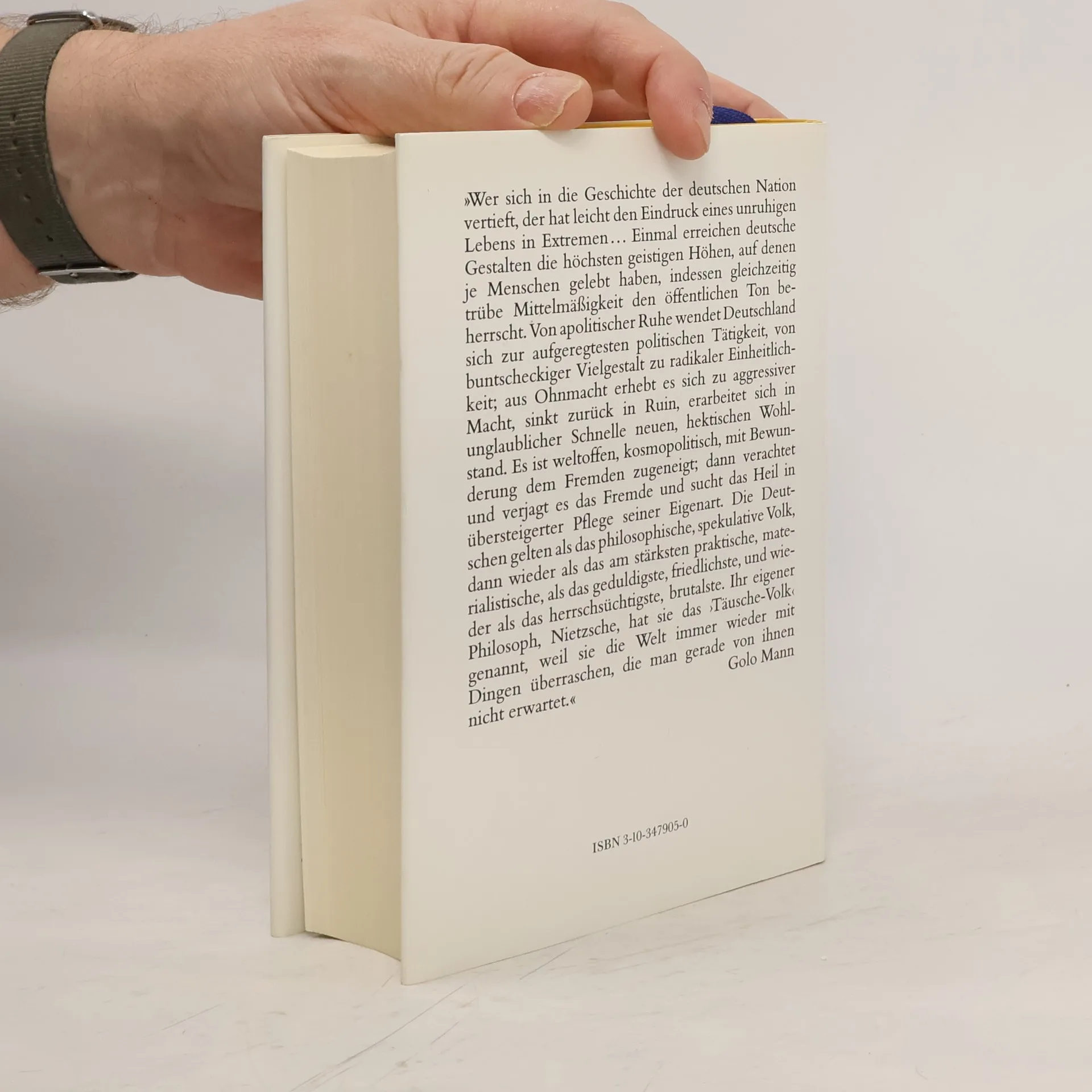 »Wer sich in die Geschichte der deutschen Nation vertieft, der hat leicht den Eindruck eines unruhigen Lebens in Extremen ... Einmal erreichen deutsche Gestalten die höchsten geistigen Höhen, auf denen je Menschen gelebt haben, indessen gleichzeitig trübe Mittelmäßigkeit den öffentlichen Ton beherrscht. Von apolitischer Ruhe wendet Deutschland sich zur aufgeregtesten politischen Tätigkeit, von buntscheckiger Vielgestalt zu radikaler Einheitlichkeit; aus Ohnmacht erhebt es sich zu aggressiver Macht, sinkt zurück in Ruin, erarbeitet sich in unglaublicher Schnelle neuen, hektischen Wohlstand. Es ist weltoffen, kosmopolitisch, mit Bewunderung dem Fremden zugeneigt; dann verachtet und verjagt es das Fremde und sucht das Heil in übersteigerter Pflege seiner Eigenart. Die Deutschen gelten als das philosophische, spekulative Volk, dann wieder als das am stärksten praktische, materialistische, als das geduldigste, friedlichste, und wieder als das herrschsüchtigste, brutalste. Ihr eigener Philosoph, Nietzsche, hat sie das 'Täusche-Volk' genannt, weil sie die Welt immer wieder mit Dingen überraschen, die man gerade von ihnen nicht erwartet.« Golo Mann