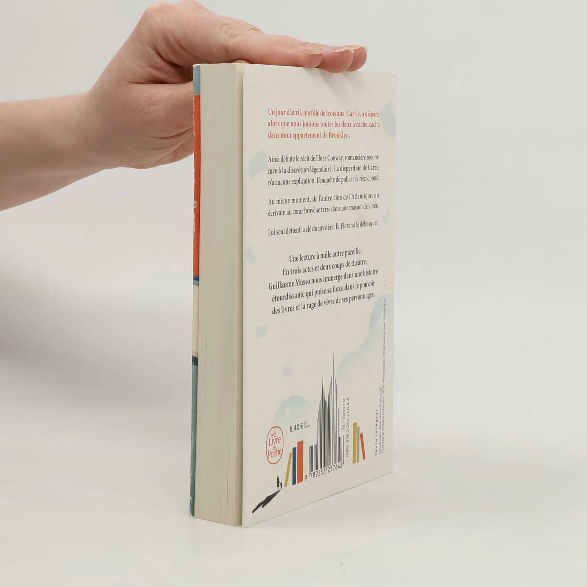 « "Un jour d'avril, ma fille de trois ans, Carrie, a disparu alors que nous jouions toutes les deux à cache-cache dans mon appartement de Brooklyn". Ainsi débute le récit de Flora Conway, romancière renommée à la discrétion légendaire. La disparition de Carrie n'a aucune explication. L'enquête de police n'a rien donné. Au même moment, de l'autre côté de l'Atlantique, un écrivain au cœur broyé se terre dans une maison délabrée. Lui seul détient la clé du mystère. Et Flora va le débusquer. Une lecture à nulle autre pareille. En trois actes et deux coups de théâtre, Guillaume Musso nous immerge dans une histoire étourdissante qui puise sa force dans le pouvoir des livres et la rage de vivre de ses personnages. »