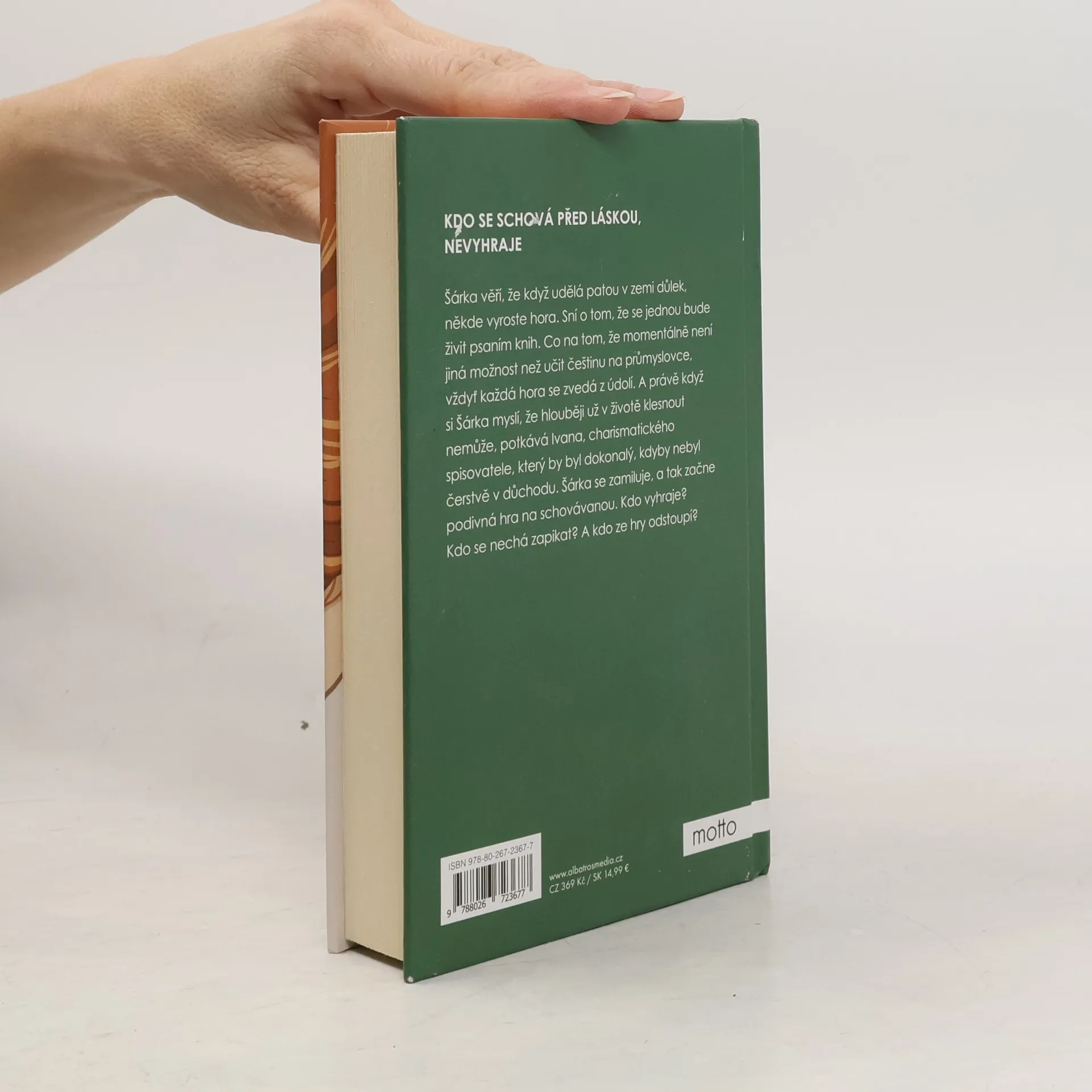 Kdo se schová před láskou, nevyhraje Šárka věří, že když udělá patou v zemi důlek, někde vyroste hora. Sní o tom, že se jednou bude živit psaním knih. Co na tom, že momentálně není jiná možnost než učit češtinu na maloměstské průmyslovce, vždyť každá hora se zvedá z údolí. V nížinách jejího života to ale právě chaoticky bzučí jako v úlu – matka randí s mladším kolegou, otec prchá k bigbítu a k pivu, bratr má silnou slabost pro marihuanu, babička trpí alzheimerem, cynický kolega srší nesnesitelným sarkasmem a Šárčin přítel David je čím dál tím víc mimo… vztah. A právě když si Šárka myslí, že hlouběji už v životě klesnout nemůže, potkává Ivana, charismatického spisovatele, který by byl dokonalý, kdyby nebyl čerstvě v důchodu. Šárka se zamiluje, a tak začne podivná hra na schovávanou. Kdo vyhraje? Kdo se nechá zapikat? A kdo ze hry odstoupí?