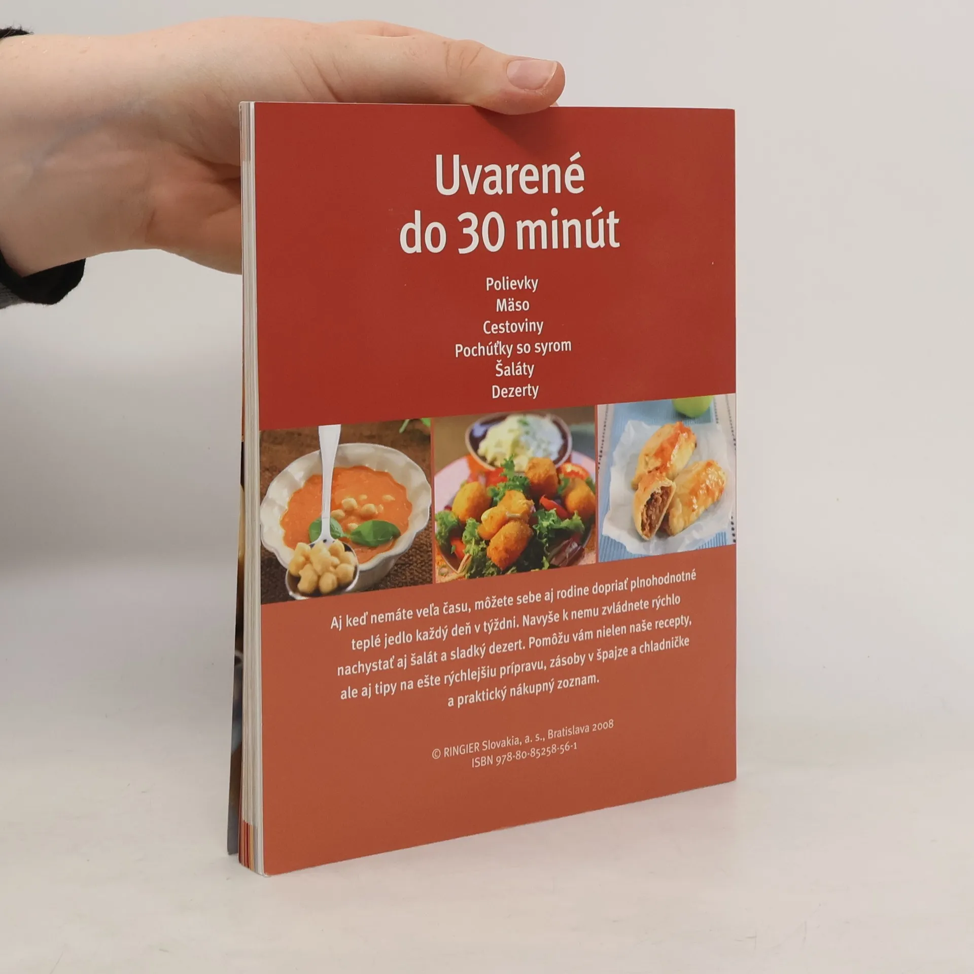Tipy na rýchlejšiu prípravu jedál v šiestich kapitolách. Polievky, Mäso, Cestoviny, Pochúťky so syrom, Šaláty, Dezerty.