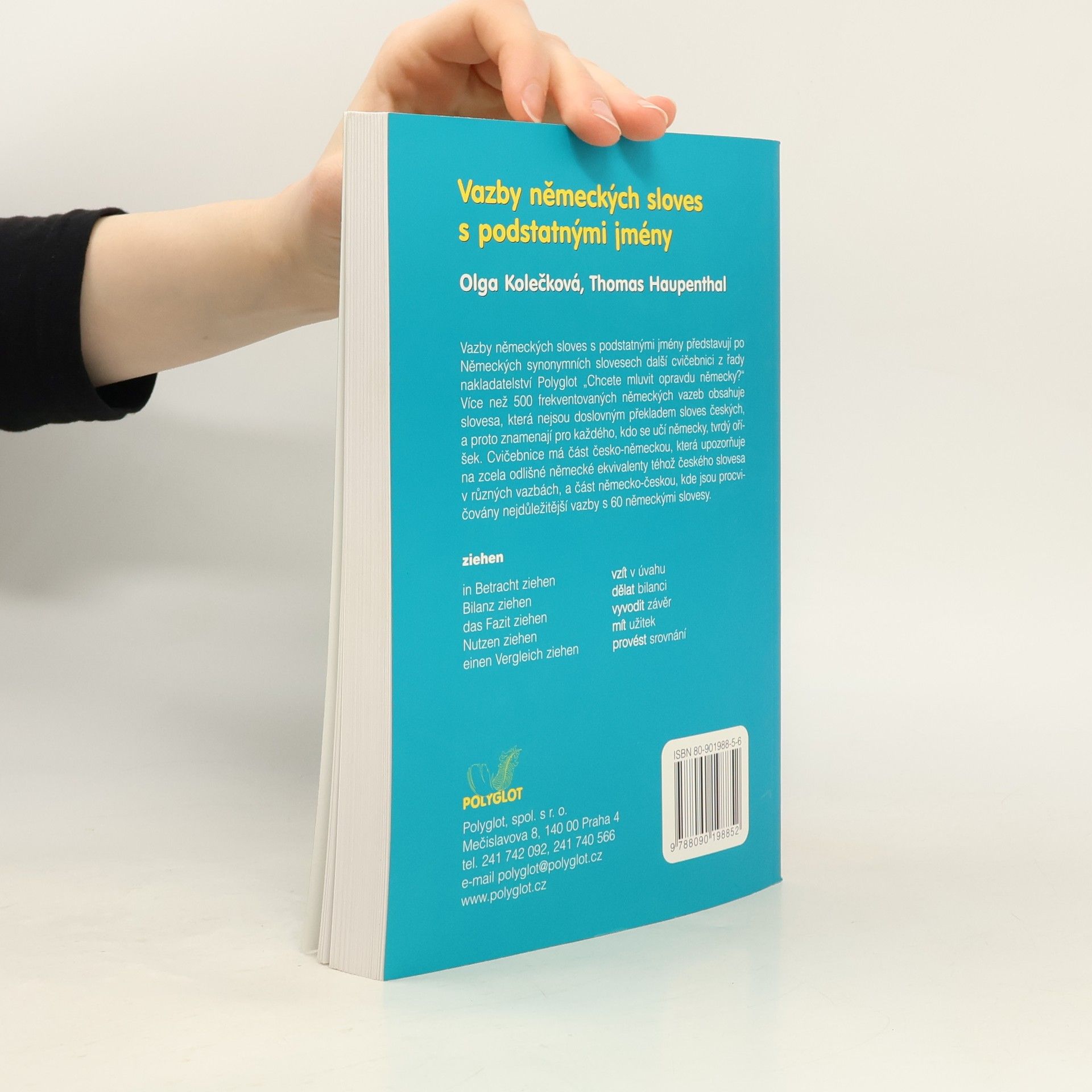 Vazby německých sloves s podstatnými jmény představují po Německých synonymních slovesech další cvičebnici z řady nakladatelství Polyglot "Chcete mluvit opravdu německy?". Více než 500 frekventovaných německých vazeb obsahuje slovesa, která nejsou doslovným překladem sloves českých, a proto znamenají pro každého, kdo se učí německy, tvrdý oříšek. Cvičebnice má část česko-německou, která upozorňuje na zcela odlišné německé ekvivalenty téhož českého slovesa v různých vazbách, a část německo-českou, kde jsou procvičkovány nejdůležitější vazby s 60 německými slovesy.