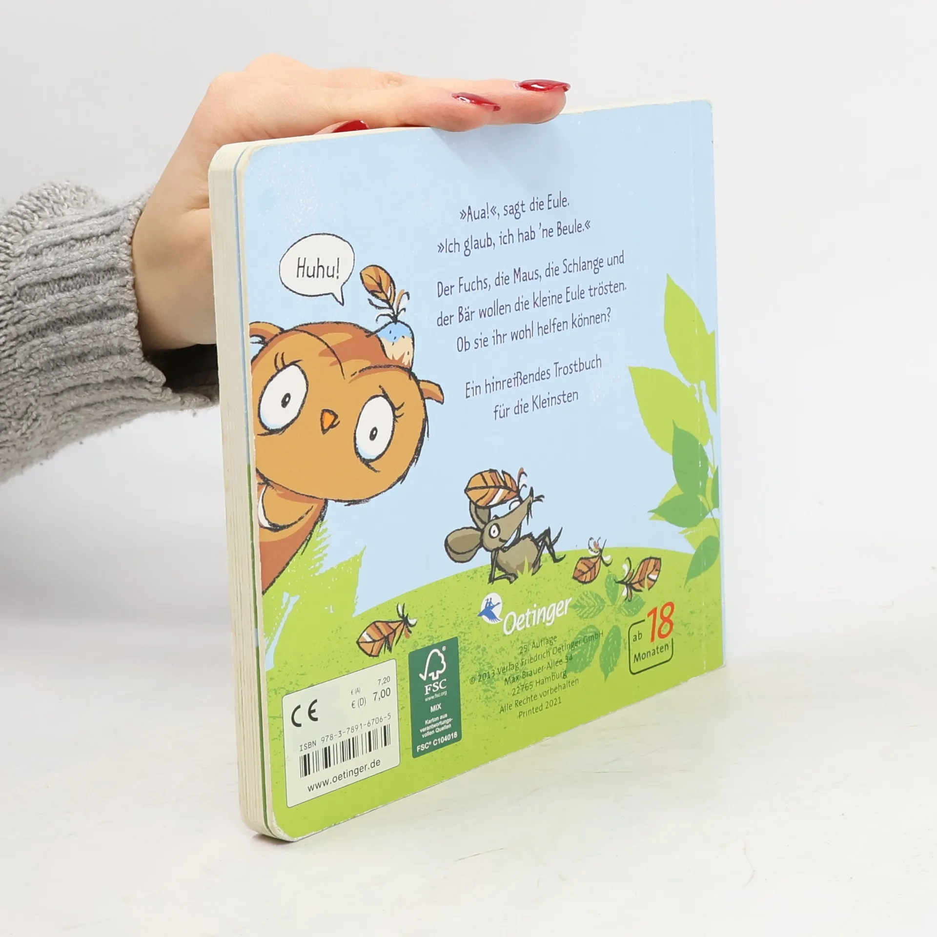 Arme kleine Eule! Ein wunderbares Trostbuch. Die kleine Eule hat eine Beule. Der Fuchs pustet, die Maus bringt ein Pflaster und die Schlange streichelt ihr die Wange. Doch was hilft am besten? Natürlich ein Kuss von der Mama! Ein absolutes Lieblingsbuch für kleine Kinder mit der süßesten Eule der Welt. Einfach zum Liebhaben und Mitfühlen! Klare Bilder und einfache Reime zum Mitsprechen sorgen für viel Spaß beim Lesen.