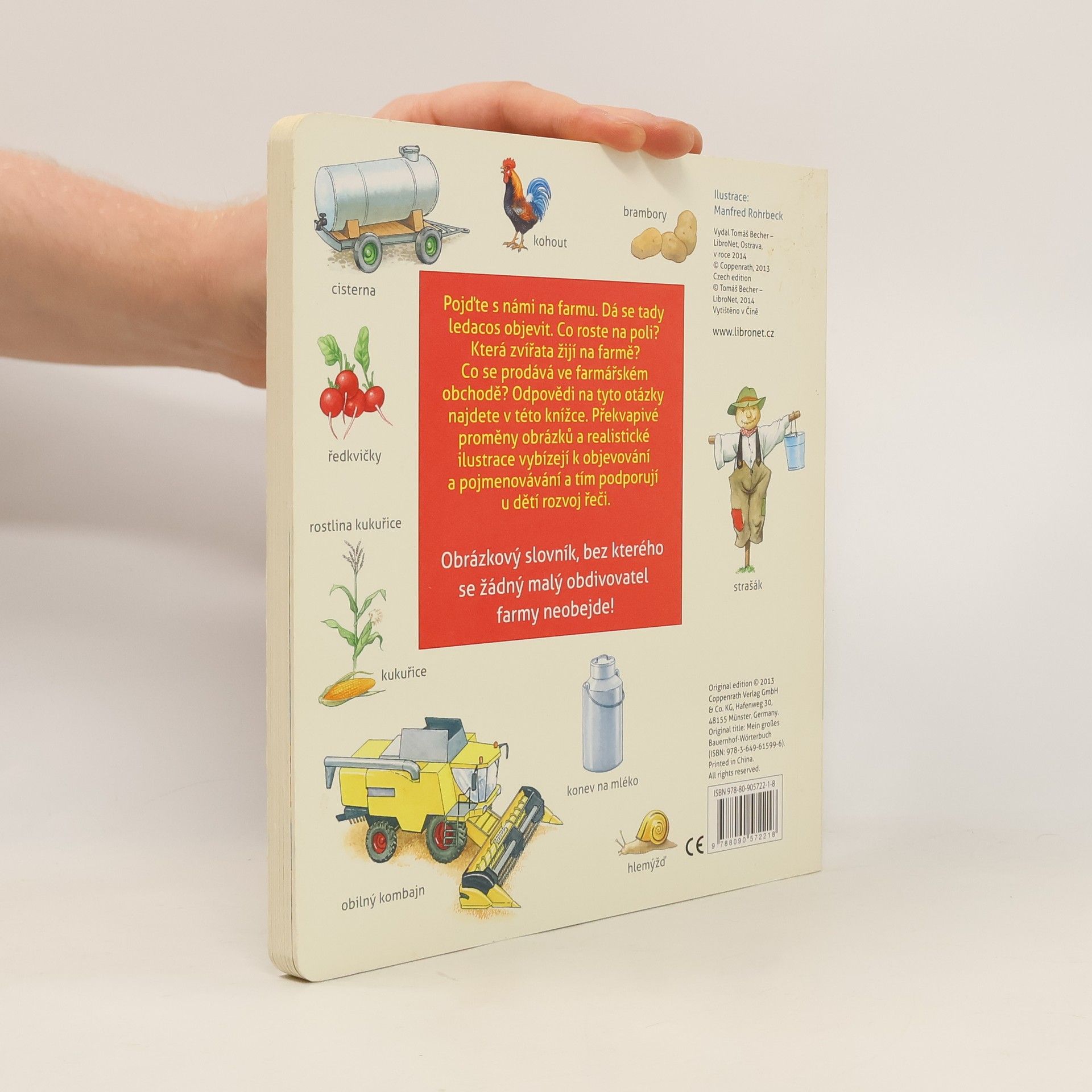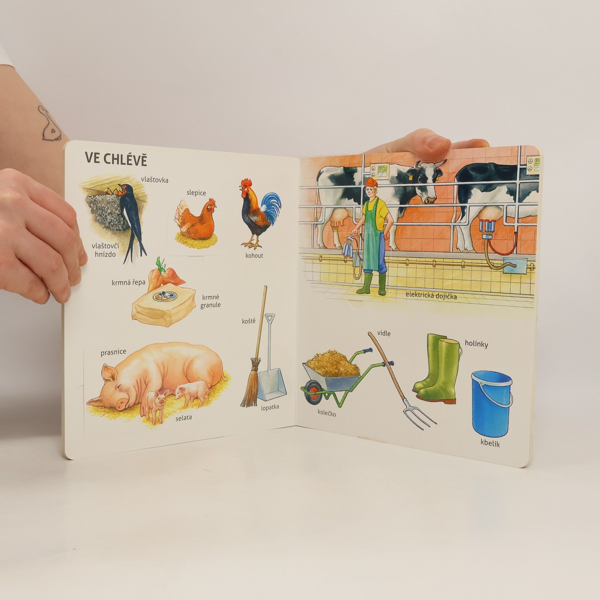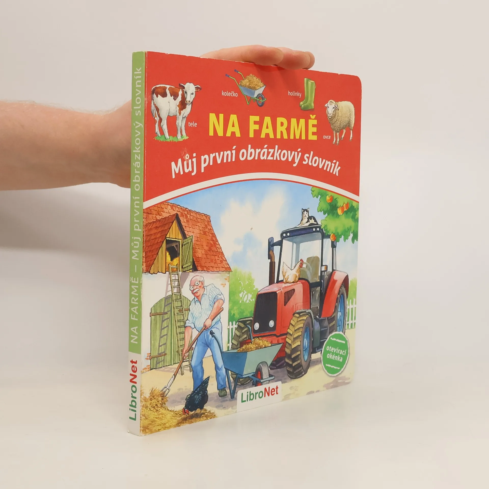 Pojďte s námi na farmu. Dá se tady ledacos objevit. Co roste na poli? Která zvířata žijí na farmě? Co se prodává ve farmářském obchodě? Odpovědi na tyto otázky najdete v této knížce. Překvapivé proměny obrázků a realistické ilustrace vybízejí k objevování a pojmenovávání a tím podporují u dětí rozvoj řeči. Obrázkový slovník, bez kterého se žádný malý obdivovatel farmy neobejde.
