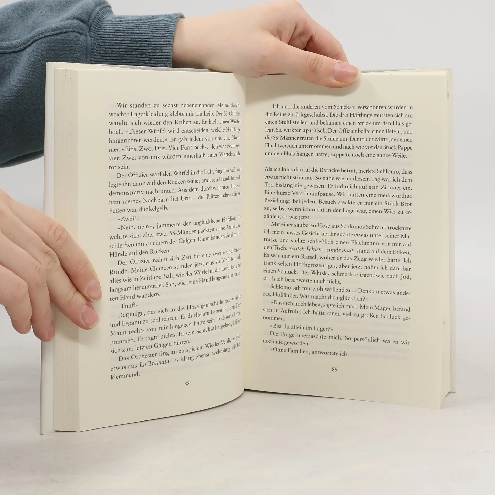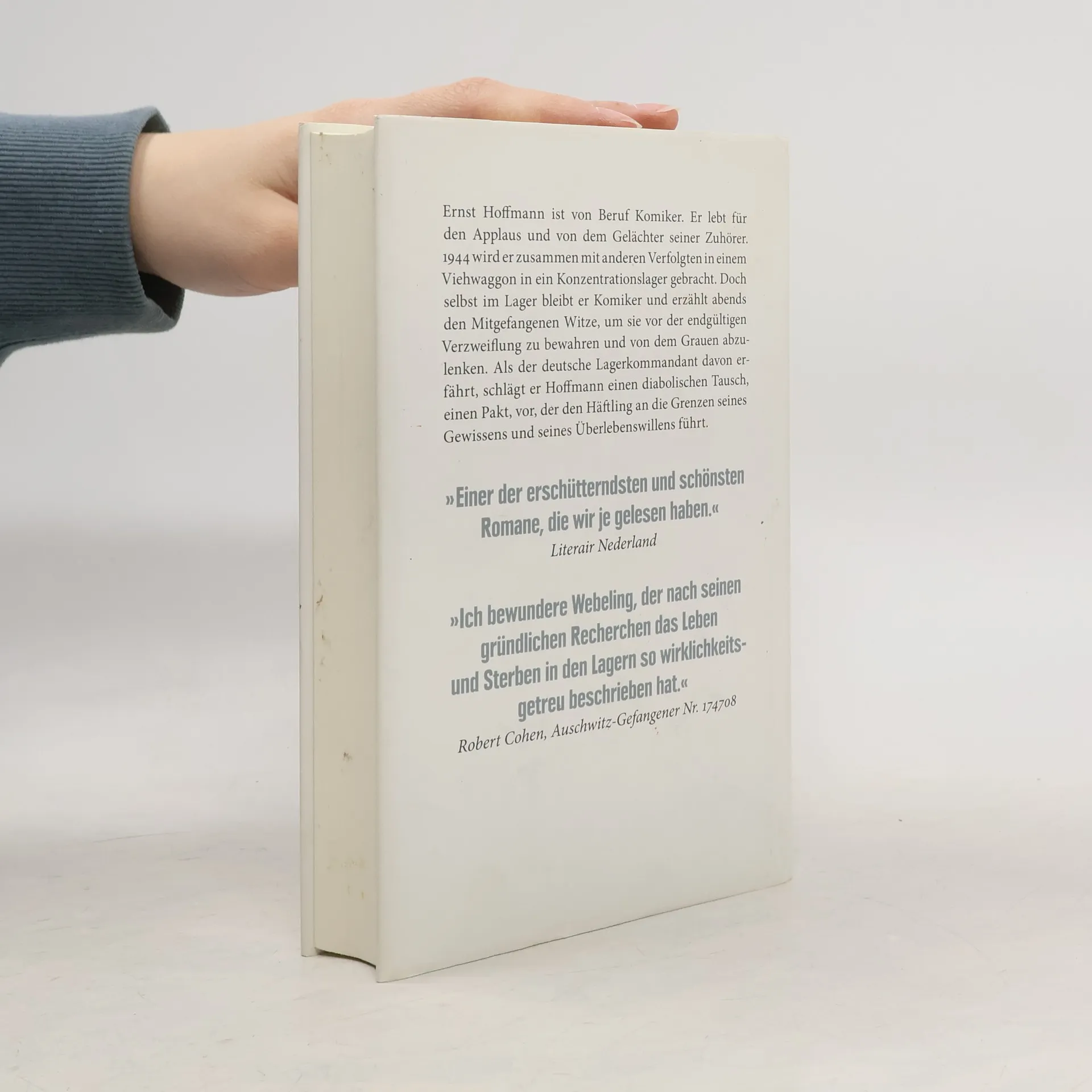Der Held und Ich-Erzähler dieses Romans, Ernst Hofman aus Amsterdam, ist von Beruf Komiker. Er lebt für den Applaus und von dem Gelächter seiner Zuhörer. Da seine verstorbene Mutter Jüdin war und er mit politischen Witzen auffällig geworden ist, wird er 1944 in einem Viehwaggon mit anderen Verfolgten in ein Konzentrationslager gebracht. Doch Ernst Hofman kann nicht anders, er bleibt selbst im Lager Komiker und erzählt, mit Billigung des Barackenältesten, abends den Mitgefangenen Witze, um sie vor der endgültigen Verzweiflung zu bewahren und von dem Grauen abzulenken. Als der deutsche Lagerkommandant das erfährt, will er Hofman dazu bringen, abends vor den SS-Leuten als Kabarettist aufzutreten. Erst weigert sich der Komiker, doch dann verspricht ihm der Lagerkommandant, die Frau, in die sich Hofman auf dem Transport verliebt hat, am Leben zu lassen. Es ist ein diabolischer Vorschlag, der den Häftling an die Grenzen seines Gewissens und seines Überlebenswillens führt.