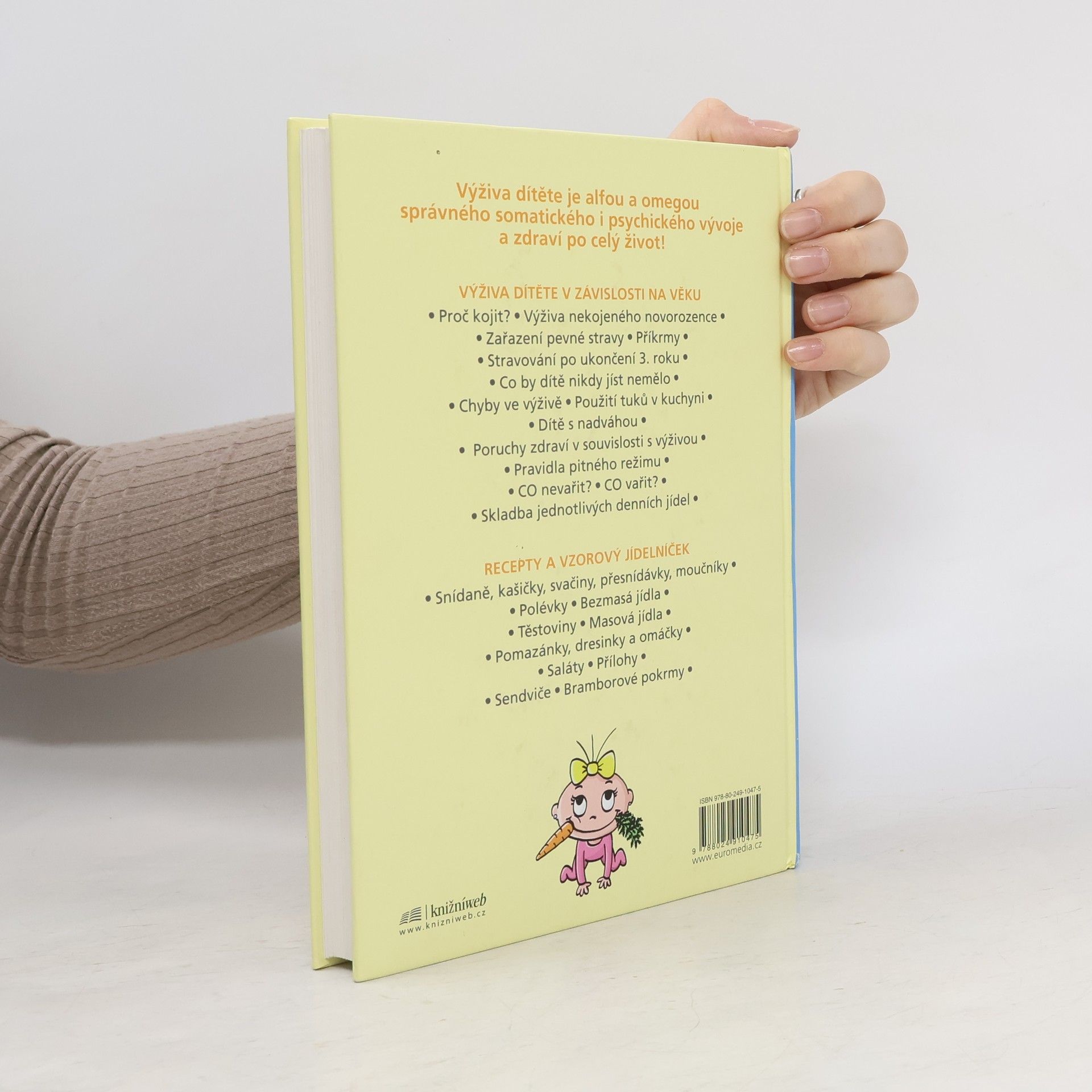 Výživa dítěte je alfou a omegou správného somatického i psychického vývoje a zdraví po celý život! Výživa dítěte v závislosti na věku o Proč kojit? o Výživa nekojeného kojence o Zařazení pevné stravy o Příkrmy o Stravování po ukončení 3. roku o Co by dítě nikdy jíst nemělo o Chyby ve výživě o Použití tuků v kuchyni o Dítě s nadváhou o Poruchy zdraví v souvislosti s výživou o Pravidla pitného režimu o CO nevařit? o CO vařit? o Skladba jednotlivých denních jídel Recepty a vzorový jídelníček o Snídaně, kašičky, svačiny, přesnídávky, moučníky o Polévky o Bezmasá jídla o Těstoviny o Masová jídla o Pomazánky, dresinky a omáčky o Saláty o Přílohy o Sendviče o Bramborové pokrmy
