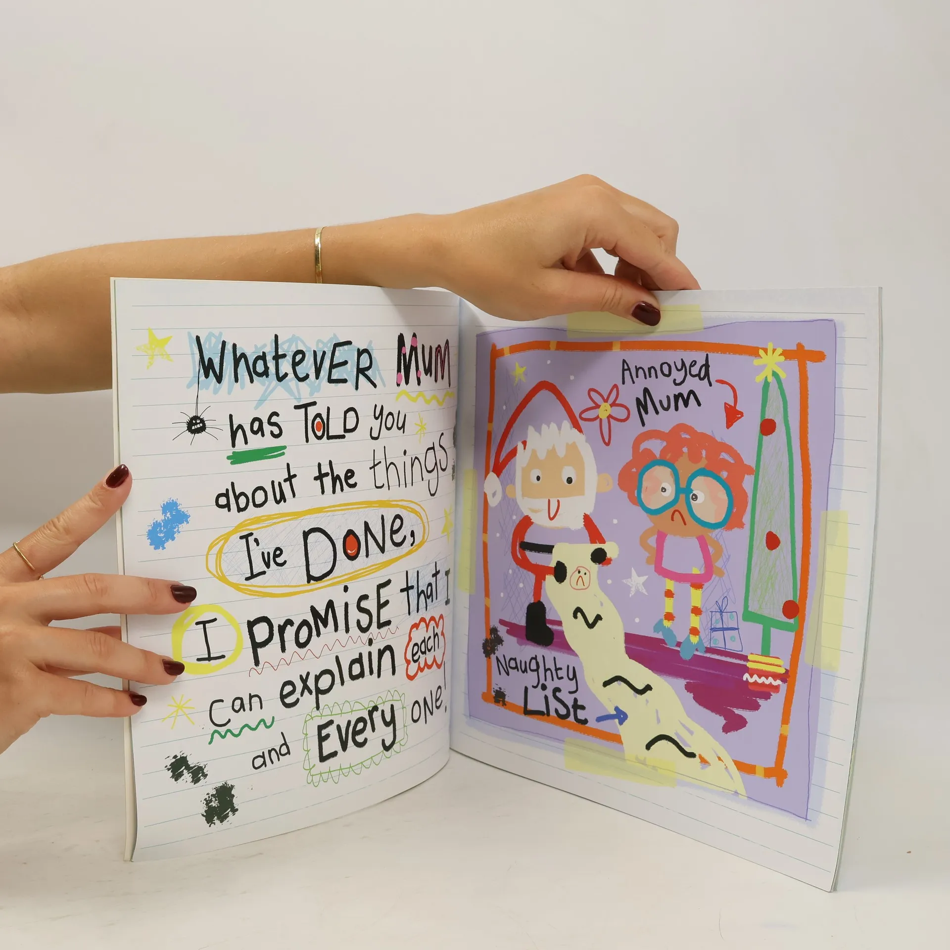 "Psst! I don't know if you know this, but Santa has a list where he writes down whether we've been naughty or nice! I was worried he might mistake me for a naughty kid, so I wrote a letter to explain myself. You should probably do the same!"--Back cover.