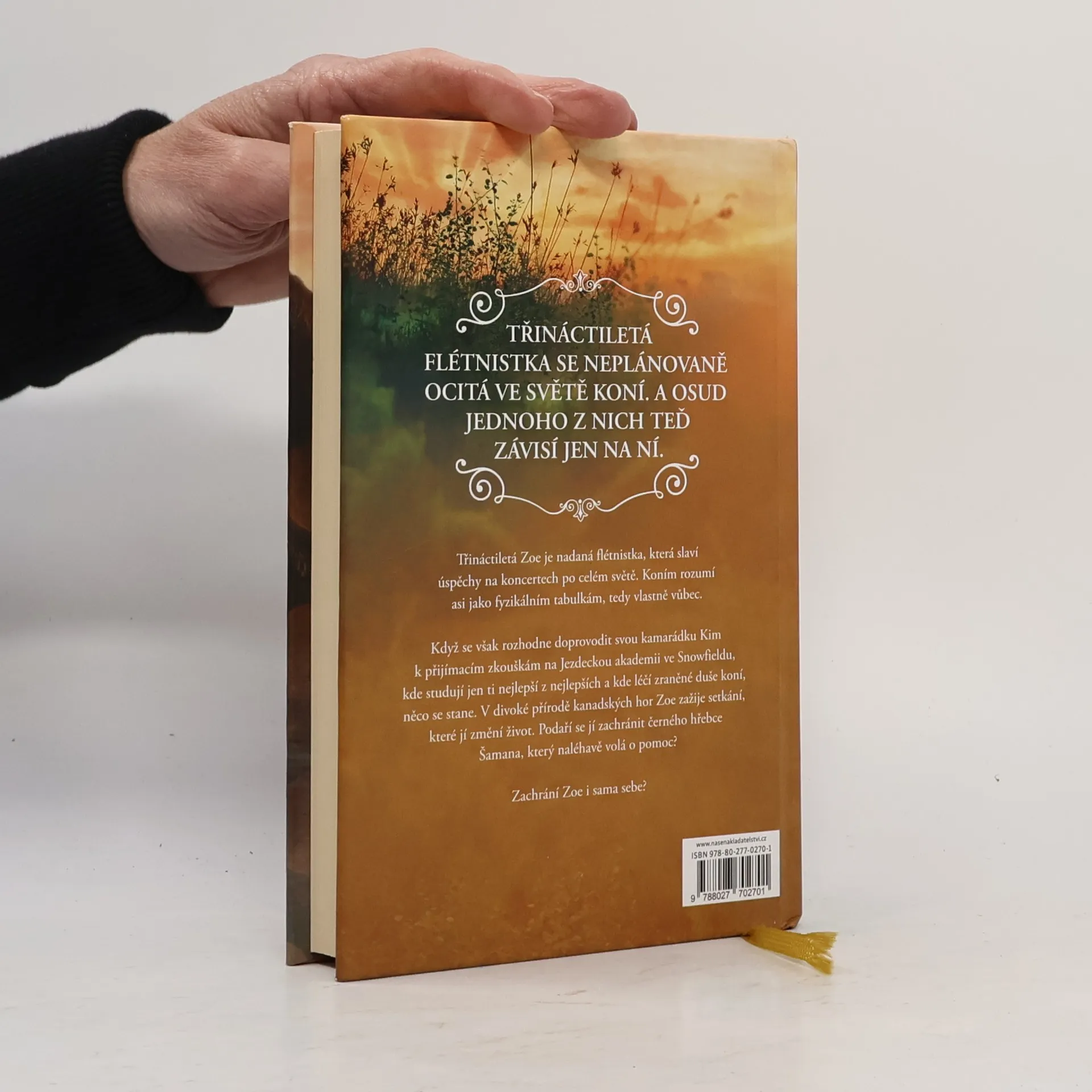 Třináctiletá Zoe je nadaná flétnistka, která slaví úspěchy na koncertech po celém světě. Koním rozumí asi jako fyzikálním tabulkám, tedy vlastně vůbec. Když se však rozhodne jet podpořit svou kamarádku Kim u přijímací zkoušky na Jezdeckou akademii ve Snowfieldu, kde studují jen ti nejlepší z nejlepších a kde léčí zraněné duše koní, něco se stane. V divoké přírodě kanadských hor Zoe zažije setkání, které jí změní život. Podaří se jí zachránit černého hřebce Šamana, který naléhavě volá o pomoc? Zachrání Zoe i sama sebe? Šamanův pohled říká, že to může udělat jen ona.