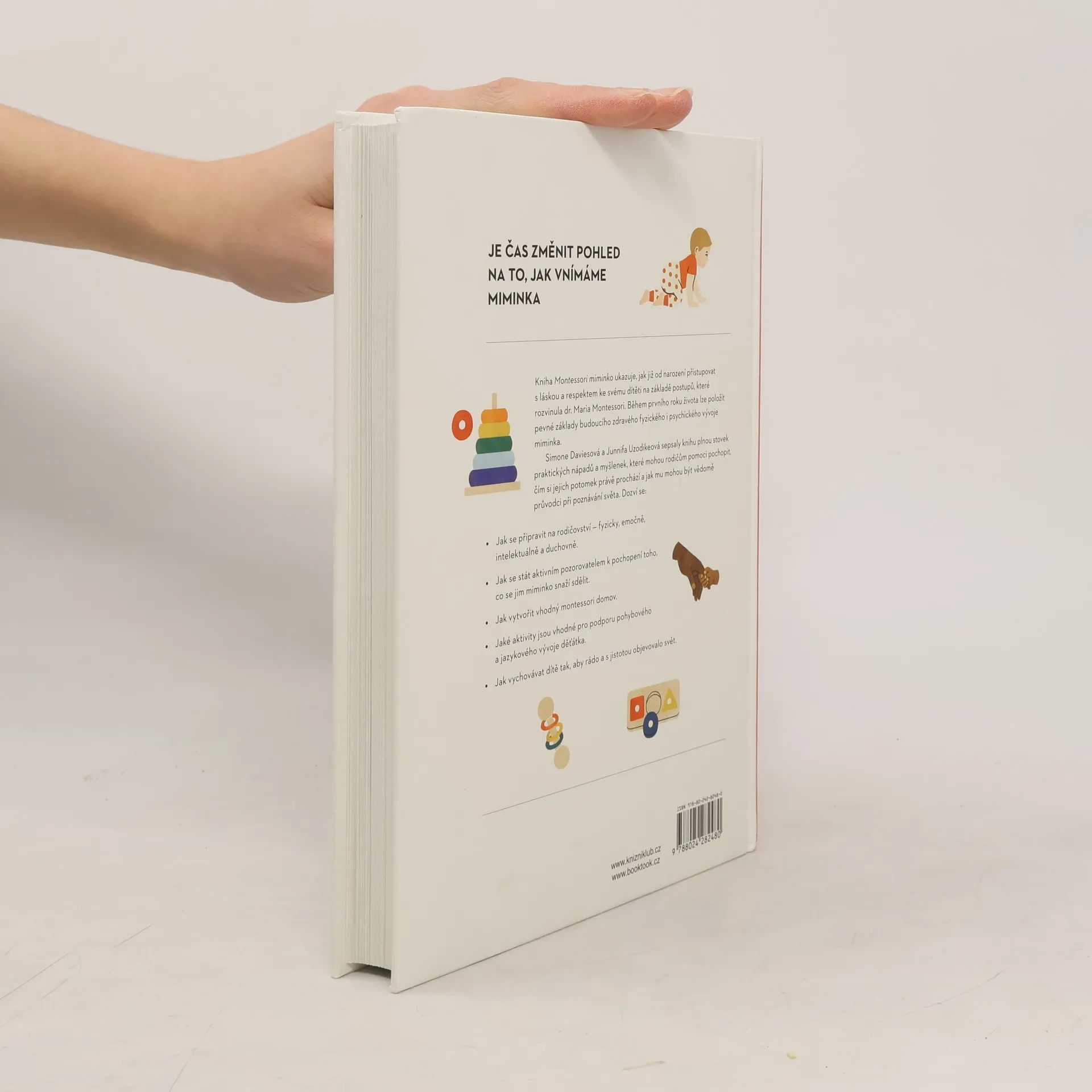 Miminka se toho v prvních měsících spoustu naučí, což však bohužel vede ke snaze o zbytečné urychlování jejich vývoje. Na trh se dostaly všelijaké pomůcky, které mají děťátku pomoci lépe spát, dříve sedět či rychleji chodit. Naučte se s touto knihou lépe vnímat své drobečky, pozorujte je, vnímejte je jako silná a schopná stvoření, která objevují okolní svět coby neúnavní badatelé. Zpomalte a dopřejte miminku čas, aby se samo protahovalo a poznávalo své tělo. Každý rodič a každé dítě mohou těžit z Montessori přístupu od prvních týdnů, prvních dnů, prvních hodin života děťátka – dokonce už v době, kdy je ještě v matčině děloze.