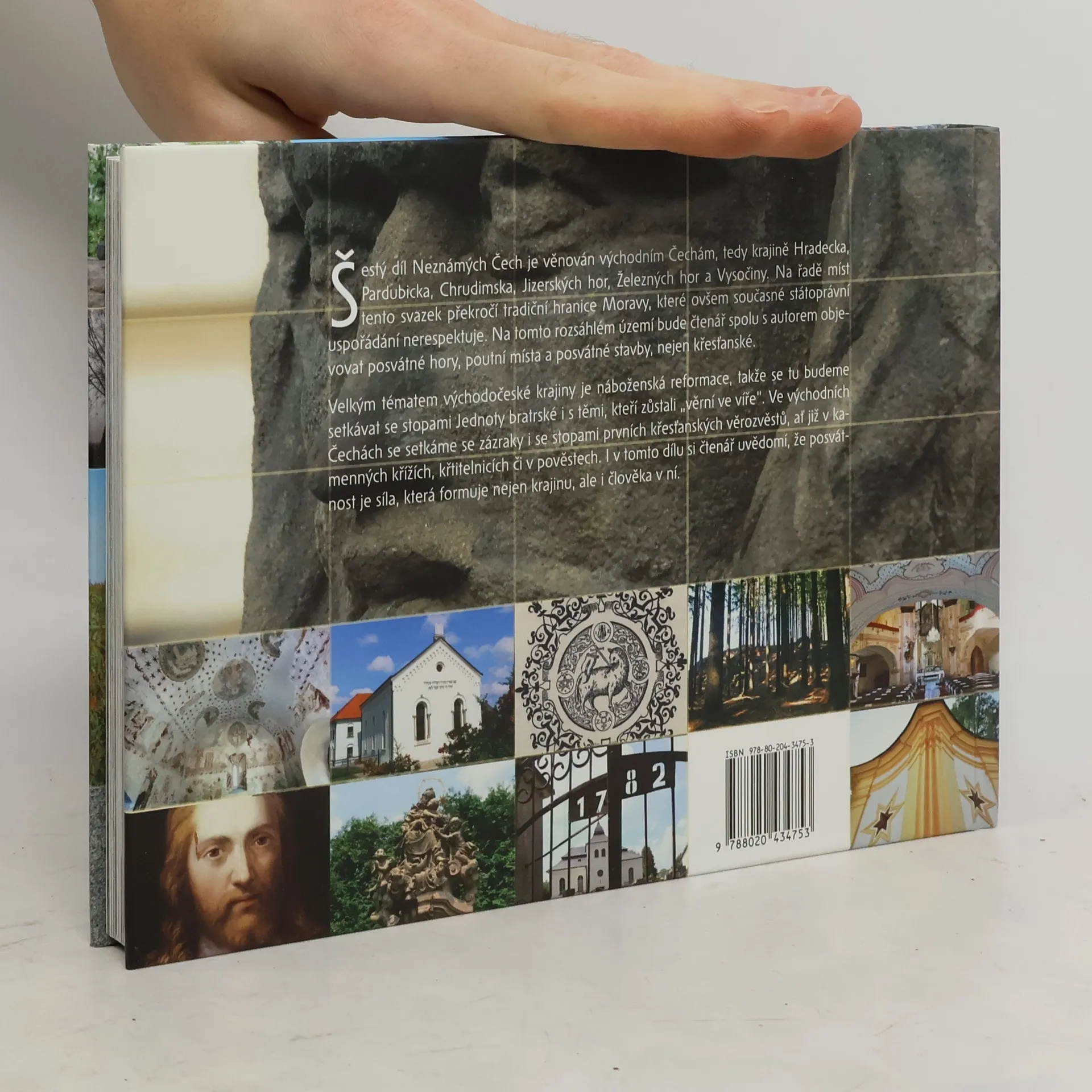 Šestý díl Neznámých Čech je věnován východním Čechám, tedy krajině Hradecka, Pardubicka, Chrudimska, Jizerských hor, Železných hor a Vysočiny. Na řadě míst tento díl překročí tradiční hranice Moravy, které ovšem současné státoprávní uspořádání nerespektuje. Na tomto rozsáhlém území bude čtenář spolu s autorem objevovat posvátné hory, poutní místa a posvátné stavby, nejen křesťanské. Velkým tématem východočeské krajiny je náboženská reformace, takže se tu budeme setkávat se stopami Jednoty bratrské i s těmi, kteří zůstali „věrní ve víře“. Ve východních Čechách se setkáme se zázraky i se stopami prvních křesťanských věrozvěstů, ať již v kamenných křížích, křtitelnicích či v pověstech. I v tomto dílu si čtenář uvědomí, že posvátnost je síla, která formuje nejen krajinu, ale i člověka v ní.