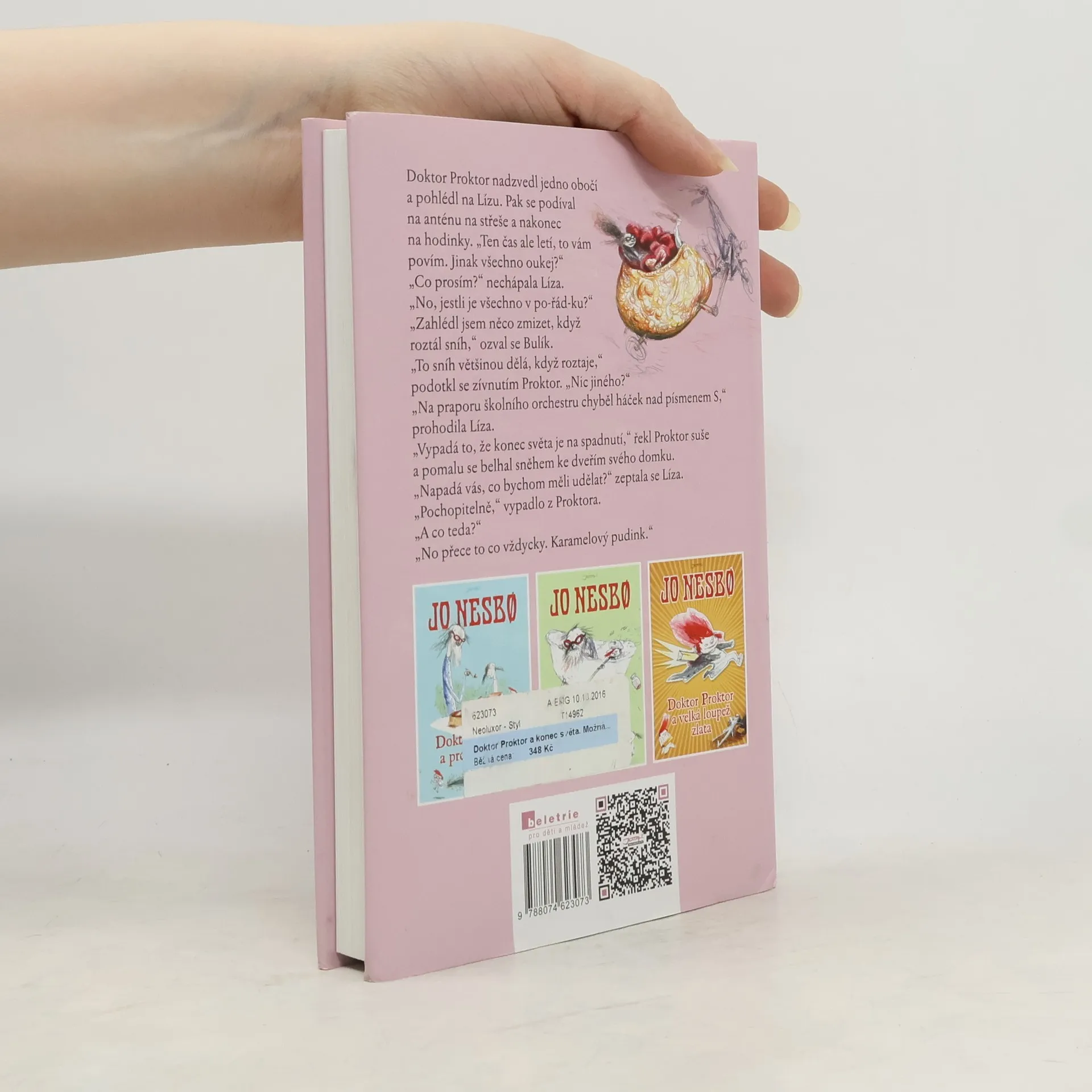 Zábavné a napínavé pokračování o doktoru Proktorovi. Další kolotoč šílených událostí se roztáčí! Doktor Proktor a konec světa. Možná… je název předposledního dílu ze série knih o šíleném, nebo aspoň skoro šíleném, profesoru Proktorovi a jeho stejně smýšlejících spoluhrdinech. Už jste slyšeli, že konec světa je na spadnutí? A že budeme patrně čelit ohromné invazi z vesmíru? Pokud si chcete všechny ty více či méně pravděpodobné předpovědi ujasnit a hodláte v dohledné době přečíst jen jednu knihu o konci světa, sedminohých peruánských pavoucích, a samozřejmě o Bulíkovi, Líze a doktoru Proktorovi, pak jste tu správně. Přečtěte si ji. Možná… Dětská (zatím...) trilogie s doktorem Proktorem v hlavní roli je ověnčena řadou významných ocenění a slaví úspěchy po celém světě. Práva na vydání zakoupilo rekordních 30 zemí!