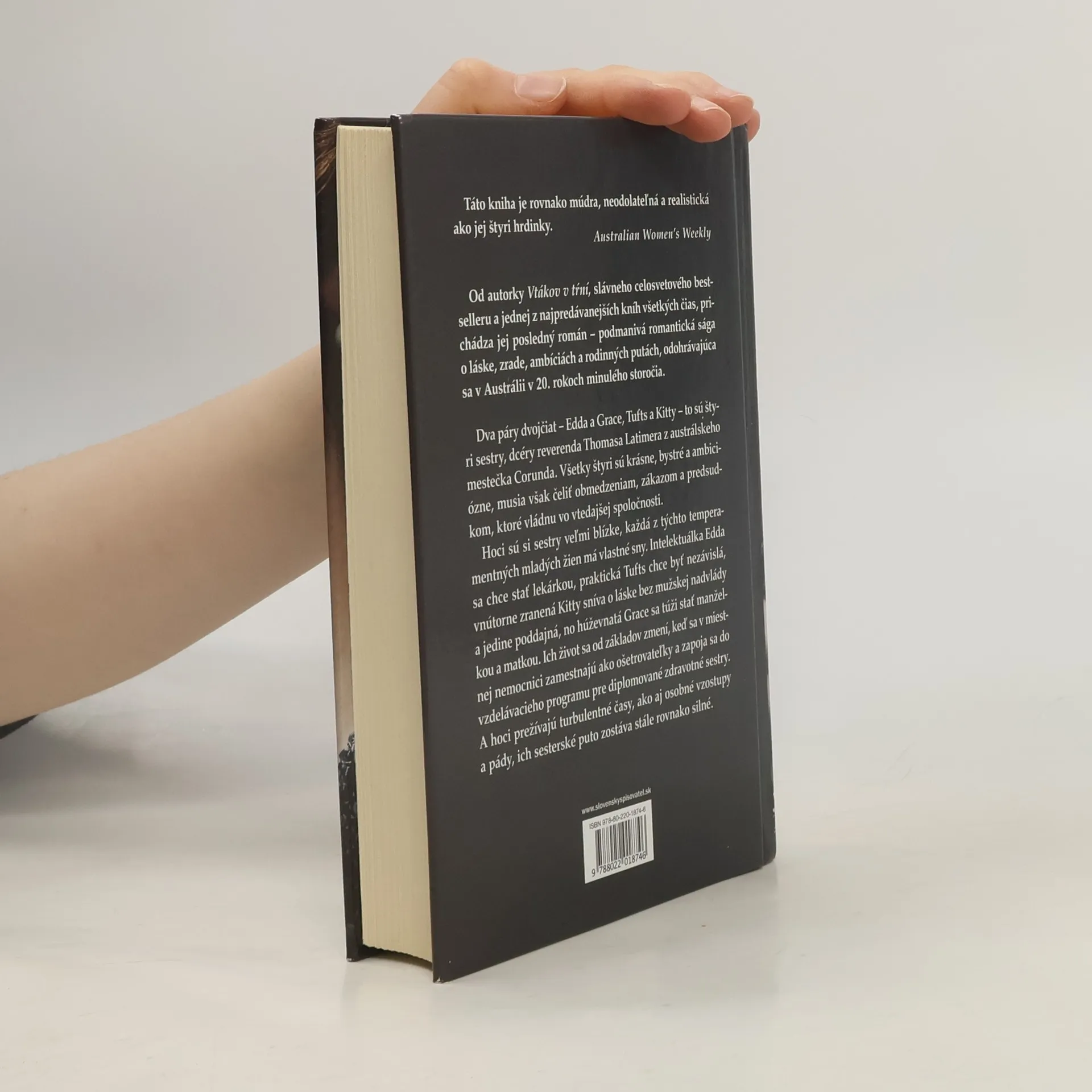 Posledný román autorky bestselleru Vtáky v tŕní. Pútavá romantická sága, odohrávajúca sa v Austrálii v 20. rokoch minulého storočia, zachytáva osudy dvoch párov dvojčiat. Edda a Grace, Tufts a Kitty – to sú štyri sestry, dcéry reverenda Latimera z mestečka Corunda. Všetky štyri sú krásne, bystré a ambiciózne, musia však čeliť predsudkom, čo vládnu vo vtedajšej spoločnosti. Ich život sa od základov zmení, keď sa v miestnej nemocnici zamestnajú ako ošetrovateľky a zapoja sa do programu pre diplomované zdravotné sestry. A hoci prežívajú turbulentné časy, ako aj osobné vzostupy a pády, ich sesterské puto zostáva stále rovnako silné.