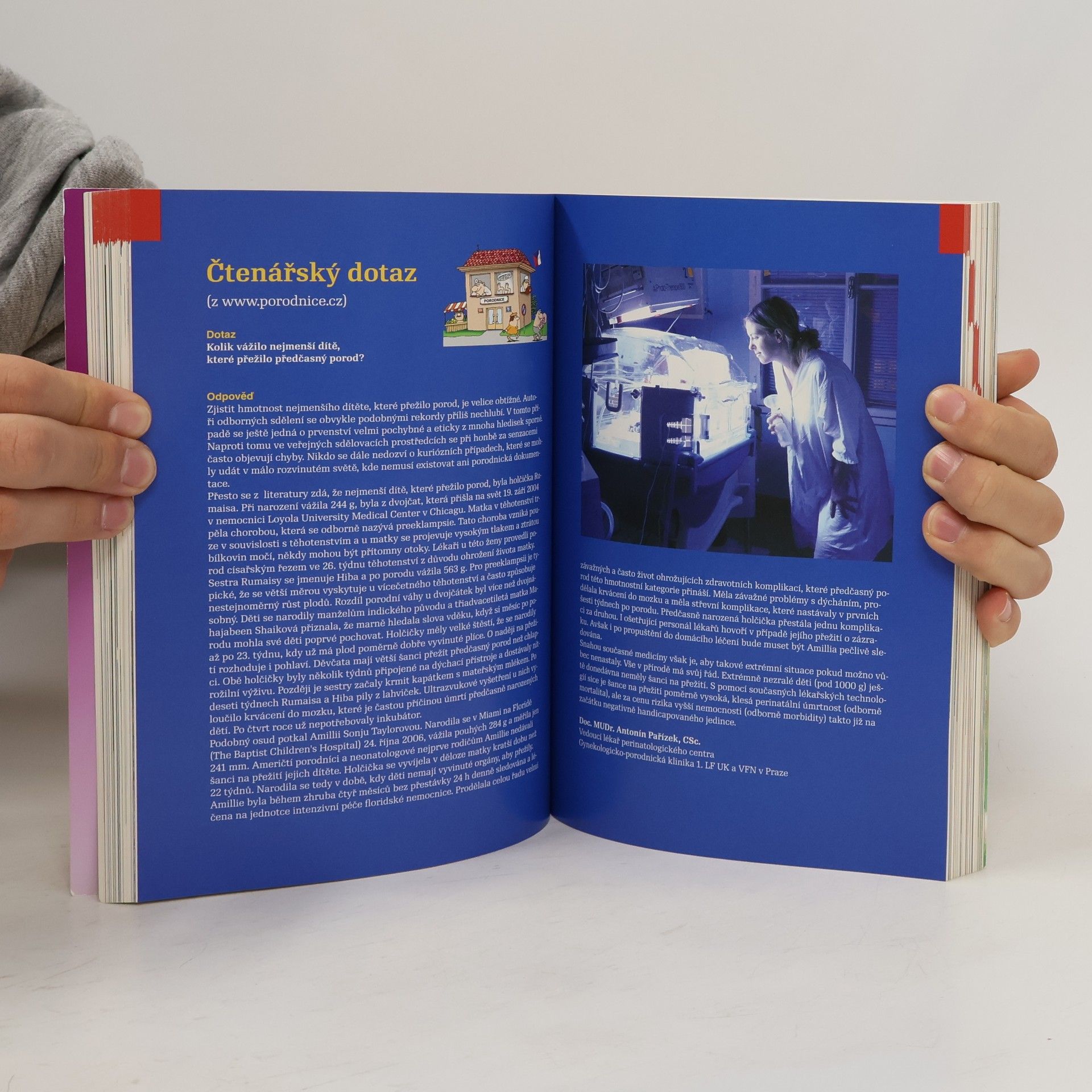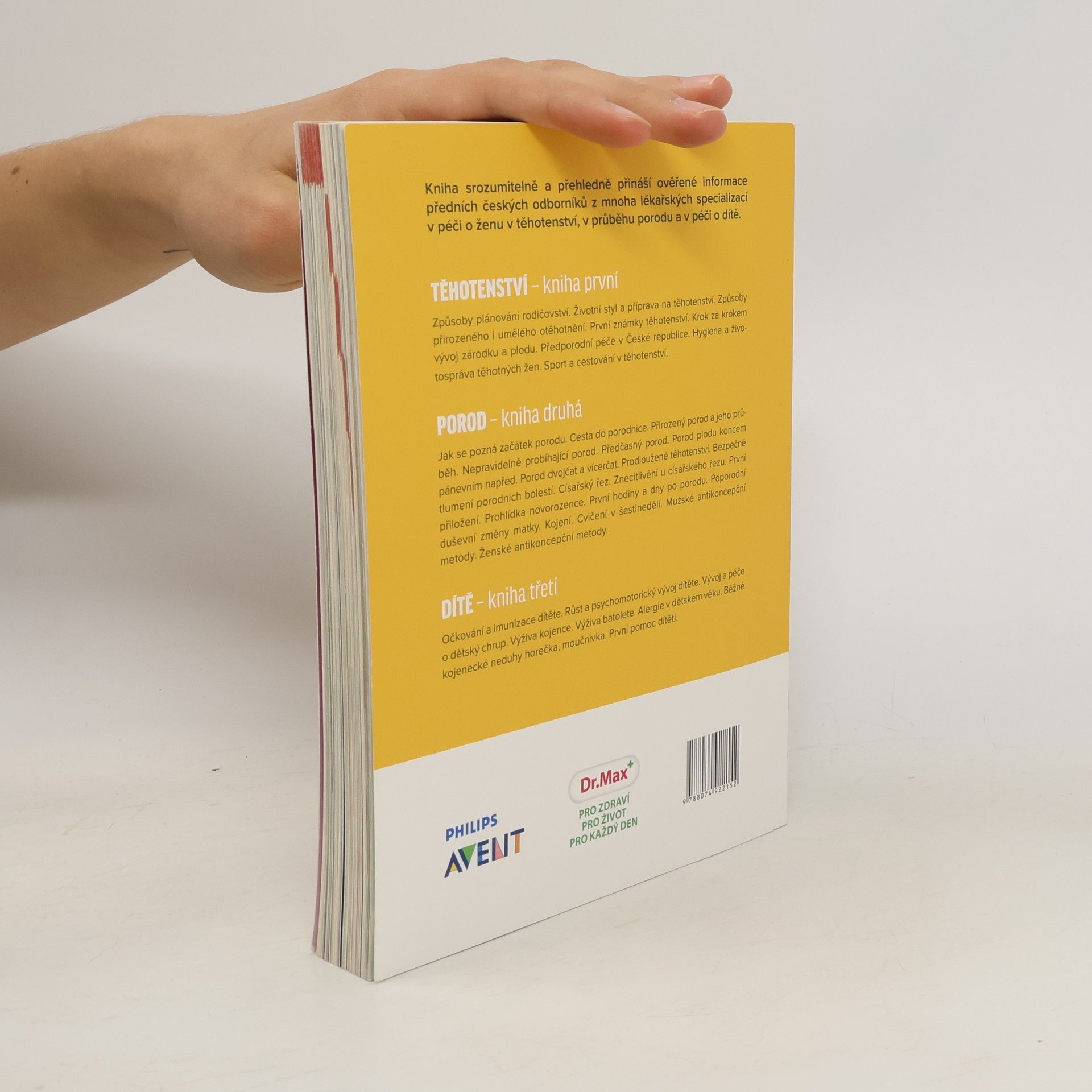 Kniha srozumitelně a přehledně přináší ověřené informace předních českých odborníků z mnoha lékařských oborů o těhotenství, porodu a péči o dítě. Jak se pozná začátek porodu. Cesta do porodnice. Porod přirozený. Průběh porodu. Nepravidelně probíhající porod. Předčasný porod. Porod plodu koncem pánevním napřed. Porod dvojčat a vícerčat. Prodloužené těhotenství. Bezpečné tlumení porodních bolestí. Císařský řez. Znecitlivění u císařského řezu. Prohlídka novorozence. První hodiny a dny po porodu. Poporodní duševní změny matky. Kojení. Cvičení v šestinedělí. Mužské antikoncepční metody. Ženské antikoncepční metody.