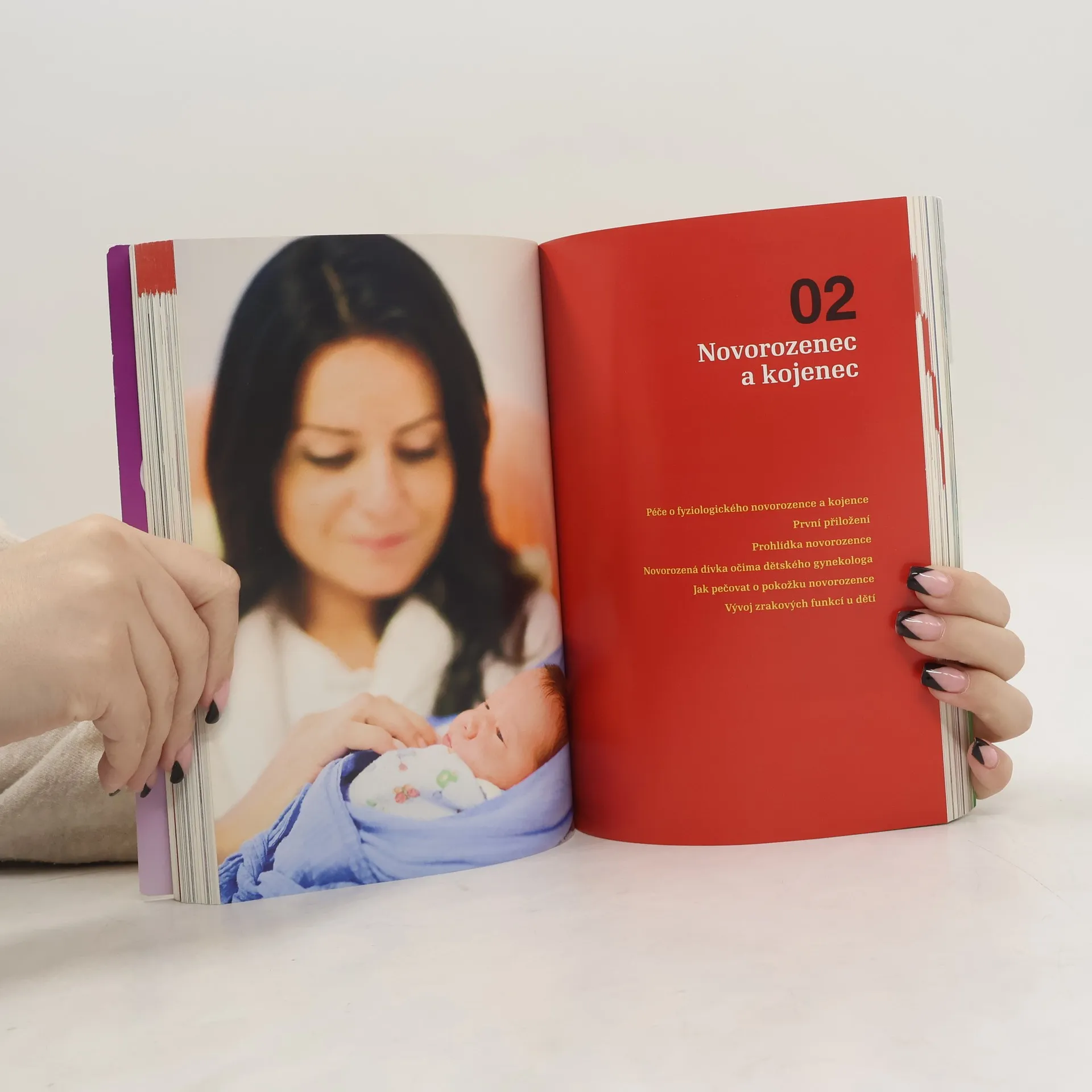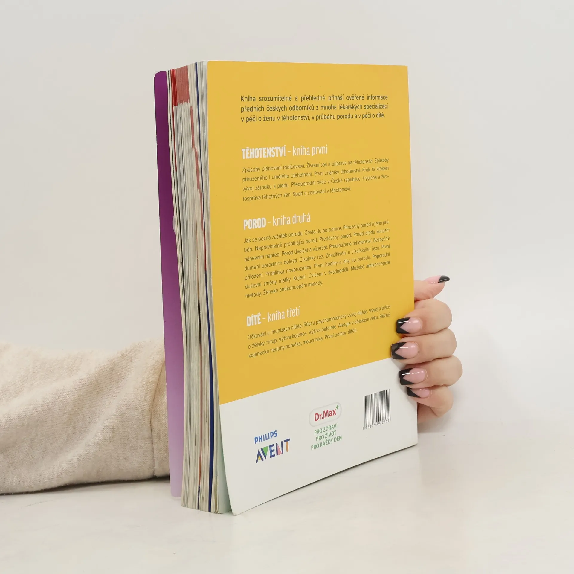 Kniha srozumitelně a přehledně přináší ověřené informace předních českých odborníků z mnoha lékařských oborů o těhotenství, porodu a péči o dítě. Jak se pozná začátek porodu. Cesta do porodnice. Porod přirozený. Průběh porodu. Nepravidelně probíhající porod. Předčasný porod. Porod plodu koncem pánevním napřed. Porod dvojčat a vícerčat. Prodloužené těhotenství. Bezpečné tlumení porodních bolestí. Císařský řez. Znecitlivění u císařského řezu. Prohlídka novorozence. První hodiny a dny po porodu. Poporodní duševní změny matky. Kojení. Cvičení v šestinedělí. Mužské antikoncepční metody. Ženské antikoncepční metody.