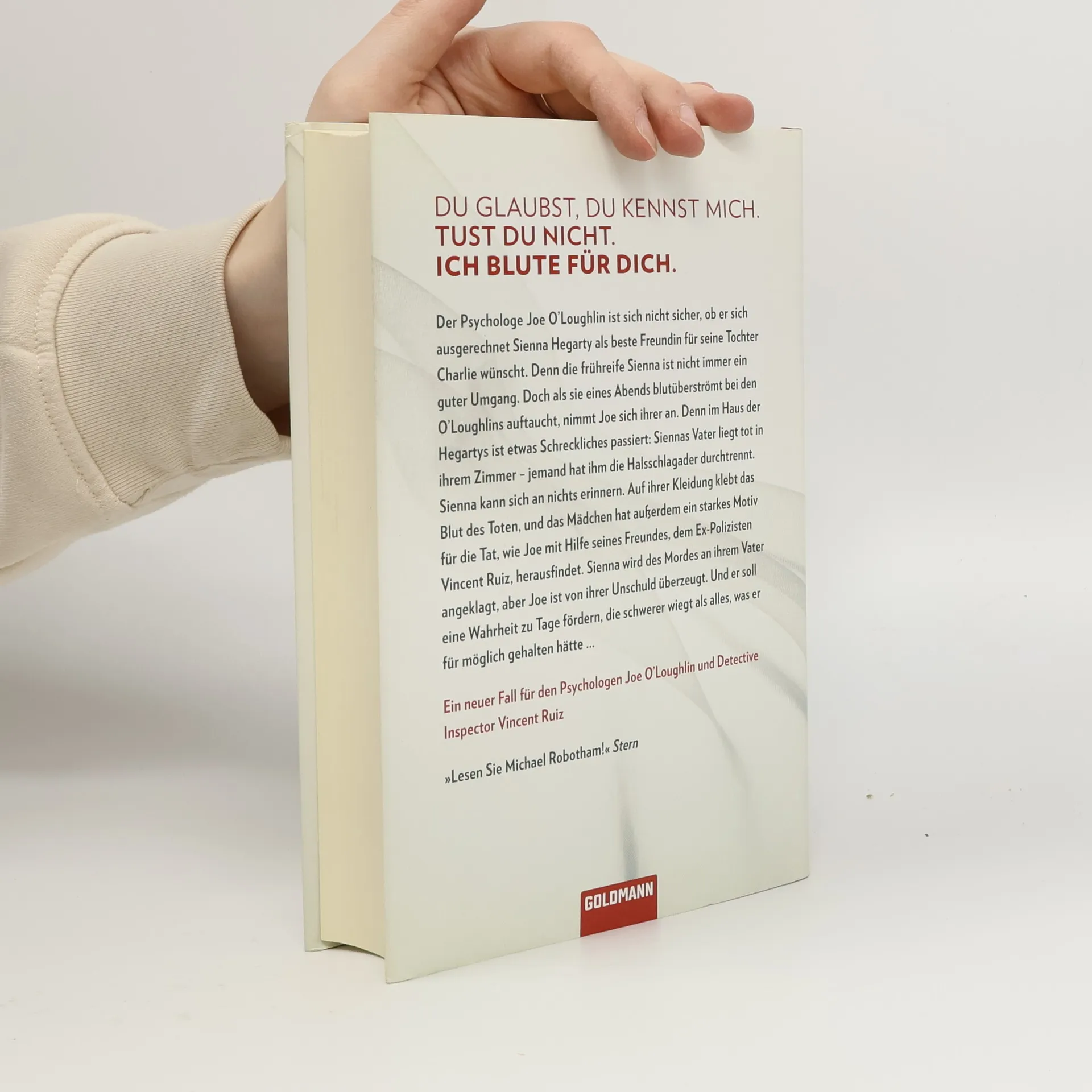 Du glaubst, du kennst mich. Tust du nicht. Ich blute für dich Der Psychologe Joe O'Loughlin ist sich nicht sicher, ob er sich ausgerechnet Sienna Hegarty als beste Freundin für seine Tochter Charlie wünscht. Denn die frühreife Sienna ist nicht immer ein guter Umgang. Doch als sie eines Abends blutüberströmt bei den O'Loughlins auftaucht, nimmt Joe sich ihrer an. Denn im Haus der Hegartys ist etwas Schreckliches passiert: Siennas Vater liegt tot in ihrem Zimmer - jemand hat ihm die Halsschlagader durchtrennt. Sienna kann sich an nichts erinnern. Auf ihrer Kleidung klebt das Blut des Toten, und das Mädchen hat außerdem ein starkes Motiv für die Tat, wie Joe mit Hilfe seines Freundes, dem Ex-Polizisten Vincent Ruiz, herausfindet. Sienna wird des Mordes an ihrem Vater angeklagt, aber Joe ist von ihrer Unschuld überzeugt. Und er soll eine Wahrheit zu Tage fördern, die schwerer wiegt als alles, was er für möglich gehalten hätte.