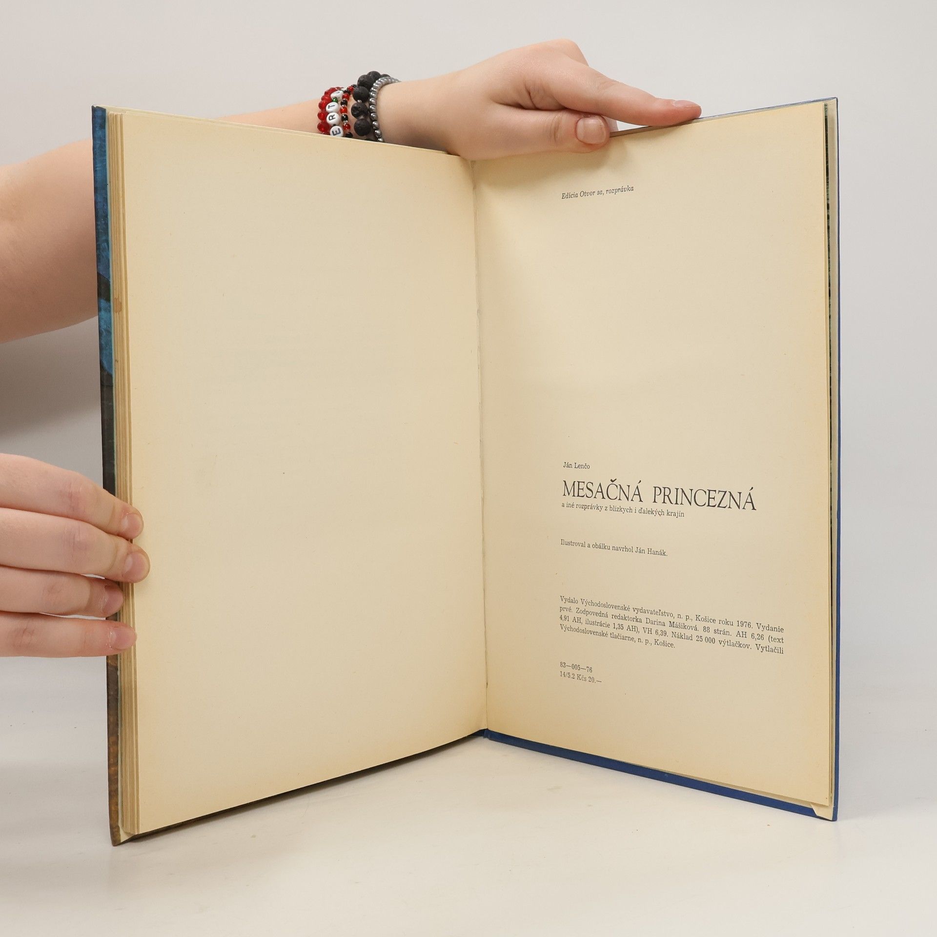 Mesačná princezná a iné rozprávky z blízkych i ďalekých krajín. Kniha obsahuje africké, nemecké, grónske, egyptské, turecké, indické a srbské rozprávky, v ktorých vystupujú princezné, králi, ale aj trpaslíci. Rozprávky: Mesačná princezná-africká rozprávka, Začarovaná princezná-nemecká rozprávka, Cudzí chlapec-grónska rozprávka, Šťastný sen malého pastierika-nemecká rozprávka, Poslední ľudia-grónska rozprávka, Traja muzikanti-nemecká rozprávka, Poklad egyptského kráľa-egyptská rozprávka, Pohostinná teľacia hlava-nemecká rozprávka, Najkrajšie dievča na svete-albánska rozprávka, Starý kúzelník a jeho deti-nemecká rozprávka, Bedár a krásna záhrada-srbská rozprávka, Človek bez srdca-nemecká rozprávka, Merdi Djanbaz-turecká rozprávka, Princezná Savitri-indická rozprávka, Čiapky trpaslíkov-nemecká rozprávka. Prvé vydanie. Cena knihy v čase vydania: 20.- Kčs.