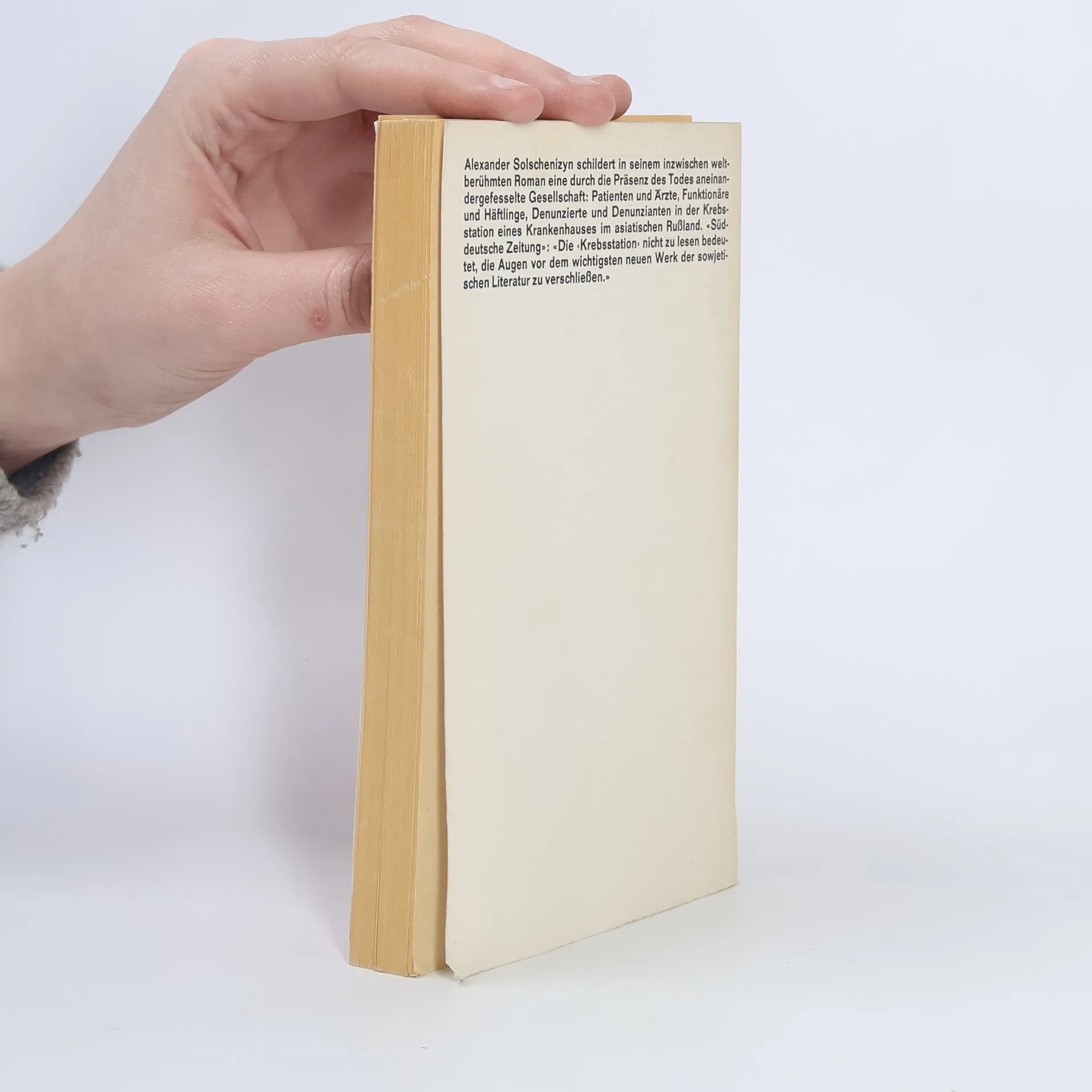 Alexander Solschenizyn schildert in seinem inzwischen weltberühmten Roman eine durch die Präsenz des Todes aneinandergefesselte Gesellschaft: Patienten und Ärzte, Funktionäre und Häftlinge, Denunzierte und Denunzianten in der Krebsstaion eines Krankenhauses im asiatischen Russland.