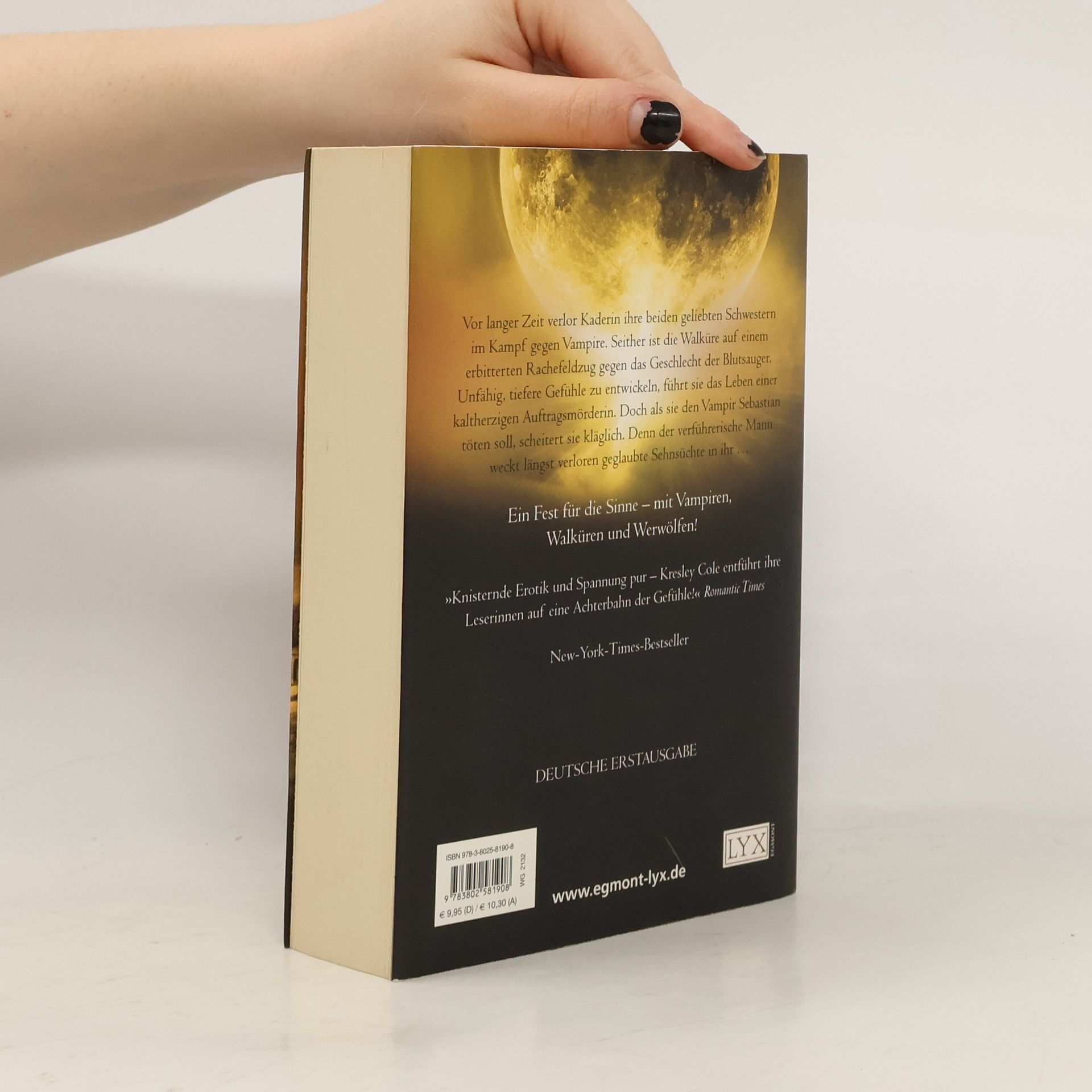 Vor langer Zeit verlor die Walküre Kaderin ihre geliebten Schwestern im Kampf gegen Vampire. Seither ist sie auf einem erbitterten Rachefeldzug gegen das Geschlecht der Blutsauger. Unfähig, tiefere Gefühle zu entwickeln, führt Kaderin das Leben einer Auftragsmörderin. Doch als sie den Vampir Sebastian töten soll, scheitert sie kläglich. Der verführerische Sebastian weckt längst verloren geglaubte Empfindungen und ein verzehrendes Verlangen in ihr. Aber kann Kaderin ihren Kampf gegen die Vampire aufgeben, nur weil einer von ihnen ihr Herz erobert hat? „Leserinnen fantastischer Liebesromane aufgepasst! Ein neues Talent hat die Bühne betreten, und ihre Mischung aus Walküren, Vampiren und Gestaltwandlern ist einfach umwerfend!“ - The Best Reviews. com „Für jeden Fan des paranormalen Genres, der eine frische, unverbrauchte Geschichte mit neuen Ideen sucht, ist Kresley Cole eine Entdeckung.“ - LoveLetter