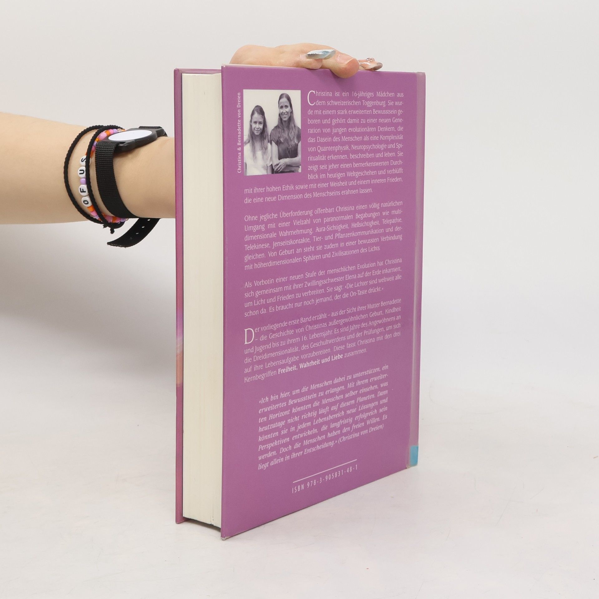 Christina ist ein 16-jähriges Mädchen aus dem Toggenburg, das mit einem stark erweiterten Bewusstsein geboren wurde. Sie gehört zu einer neuen Generation von jungen Denkern, die das menschliche Dasein als eine Komplexität aus Quantenphysik, Neuropsychologie und Spiritualität erkennen. Christina beeindruckt mit ihrer hohen Ethik, Weisheit und einem inneren Frieden, der eine neue Dimension des Menschseins erahnen lässt. Sie zeigt einen natürlichen Umgang mit paranormalen Fähigkeiten wie multidimensionaler Wahrnehmung, Aura-Sichtigkeit, Hellsichtigkeit, Telepathie und Tierkommunikation. Von Geburt an ist sie in bewusster Verbindung mit höheren Dimensionen und Zivilisationen des Lichts. Gemeinsam mit ihrer Zwillingsschwester Elena ist sie auf der Erde inkarniert, um Licht und Frieden zu verbreiten. Band 1 erzählt aus der Sicht ihrer Mutter Bernadette von Christinas außergewöhnlicher Geburt, Kindheit und Jugend bis zu ihrem 16. Lebensjahr. Diese Jahre sind geprägt von der Anpassung an die Dreidimensionalität und der Vorbereitung auf ihre Lebensaufgabe, die sie mit den Begriffen Freiheit, Wahrheit und Liebe zusammenfasst. Christina möchte den Menschen helfen, ein erweitertes Bewusstsein zu erlangen, um neue Lösungen für die Herausforderungen der Welt zu finden. Doch letztlich liegt die Entscheidung im freien Willen der Menschen.