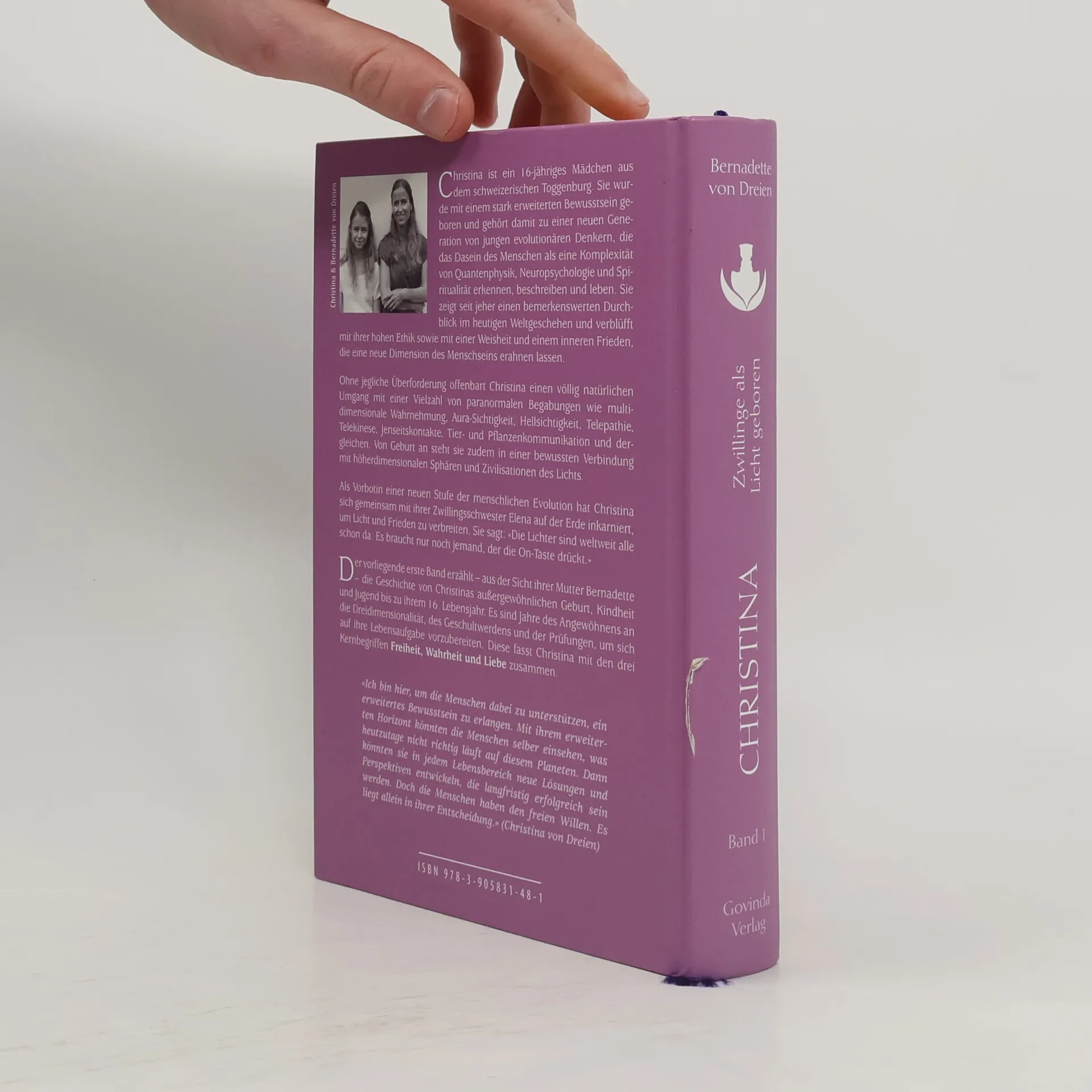Christina ist ein 16-jähriges Mädchen aus dem Toggenburg, das mit einem stark erweiterten Bewusstsein geboren wurde. Sie gehört zu einer neuen Generation von jungen Denkern, die das menschliche Dasein als eine Komplexität aus Quantenphysik, Neuropsychologie und Spiritualität erkennen. Christina beeindruckt mit ihrer hohen Ethik, Weisheit und einem inneren Frieden, der eine neue Dimension des Menschseins erahnen lässt. Sie zeigt einen natürlichen Umgang mit paranormalen Fähigkeiten wie multidimensionaler Wahrnehmung, Aura-Sichtigkeit, Hellsichtigkeit, Telepathie und Tierkommunikation. Von Geburt an ist sie in bewusster Verbindung mit höheren Dimensionen und Zivilisationen des Lichts. Gemeinsam mit ihrer Zwillingsschwester Elena ist sie auf der Erde inkarniert, um Licht und Frieden zu verbreiten. Band 1 erzählt aus der Sicht ihrer Mutter Bernadette von Christinas außergewöhnlicher Geburt, Kindheit und Jugend bis zu ihrem 16. Lebensjahr. Diese Jahre sind geprägt von der Anpassung an die Dreidimensionalität und der Vorbereitung auf ihre Lebensaufgabe, die sie mit den Begriffen Freiheit, Wahrheit und Liebe zusammenfasst. Christina möchte den Menschen helfen, ein erweitertes Bewusstsein zu erlangen, um neue Lösungen für die Herausforderungen der Welt zu finden. Doch letztlich liegt die Entscheidung im freien Willen der Menschen.
