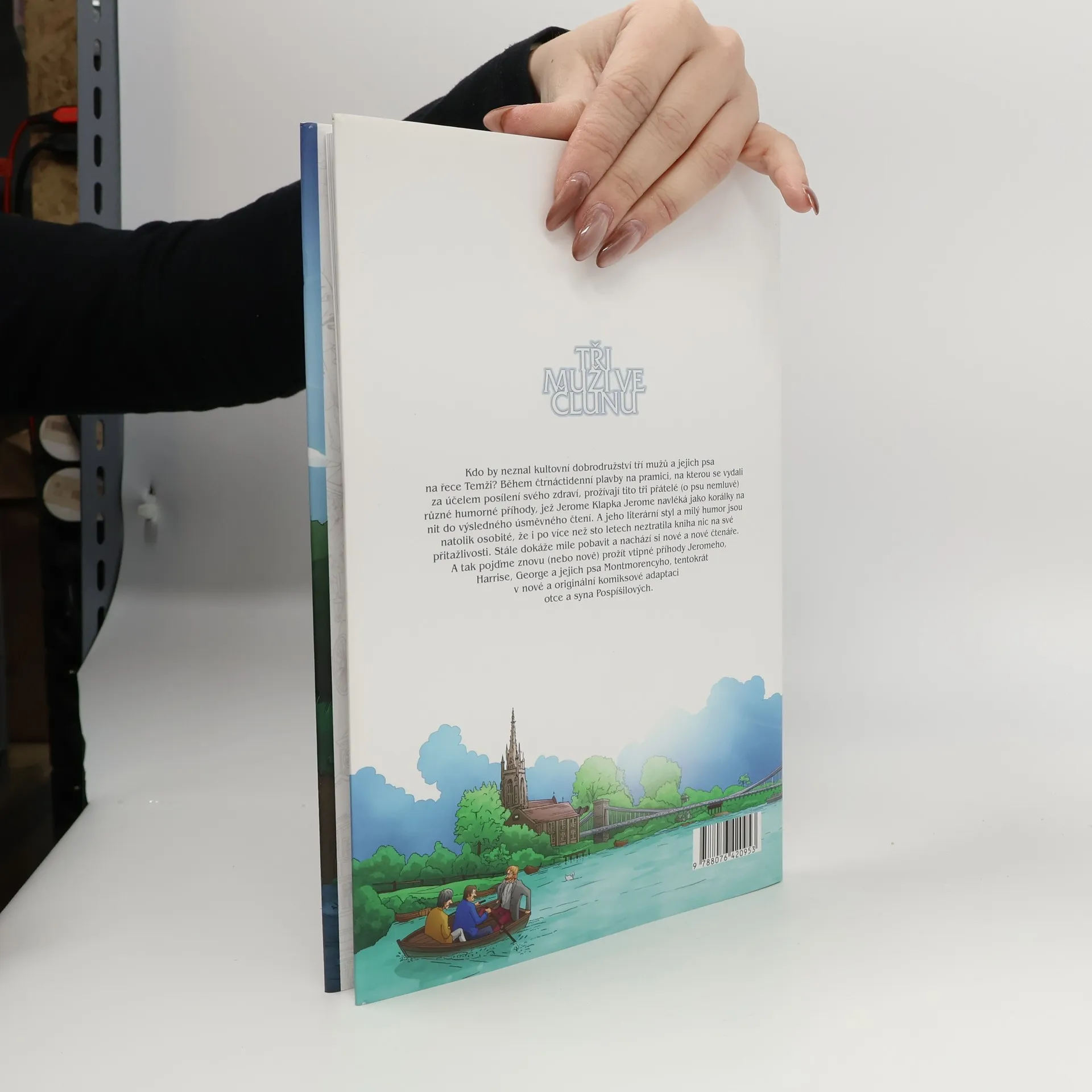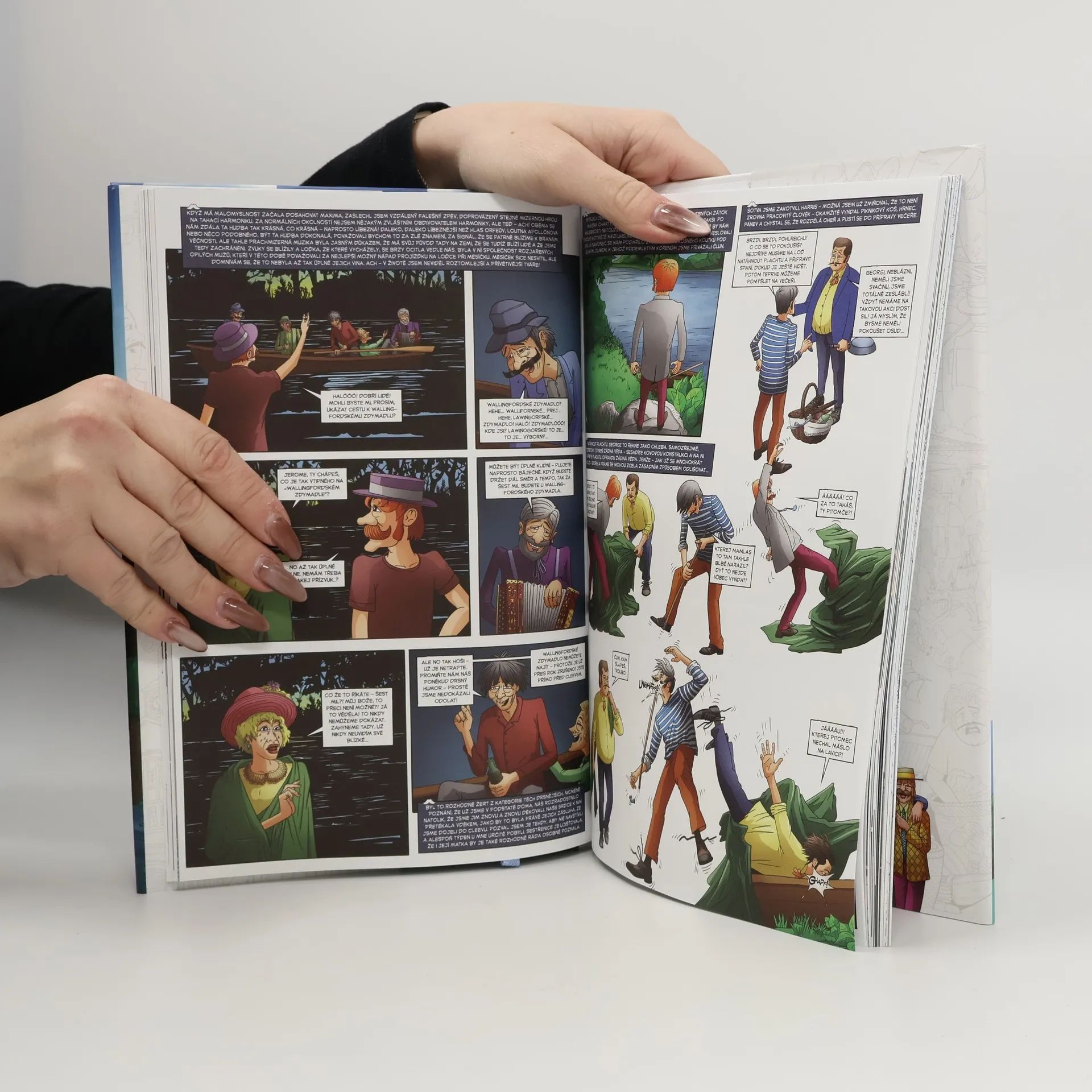 Grafický román podle slavné předlohy z pera Jerome Klapky Jeromeho. Příběh začíná setkáním tří dobrých přátel. Obklopeni tabákovým dýmem si vzájemně začnou stěžovat na přerůzné neduhy, které je poslední dobou pronásledují. Po pečlivém rozboru všemožných nemocí a problémů pánové usoudí, že jediné, co jim může zachránit psychické i fyzické zdraví, je příjemná dovolená. A tak se rozhodnou vyrazit i se psem Montmorencym na řeku. Tak začíná nesmrtelná kniha Tři muži ve člunu, kterou bez velké nadsázky můžeme označit za základ moderního britského humoru. Dočkala se mnoha filmových i televizních zpracování a časopis Guardian ji zařadil mezi padesát nejvýznamnějších literárních děl všech dob.