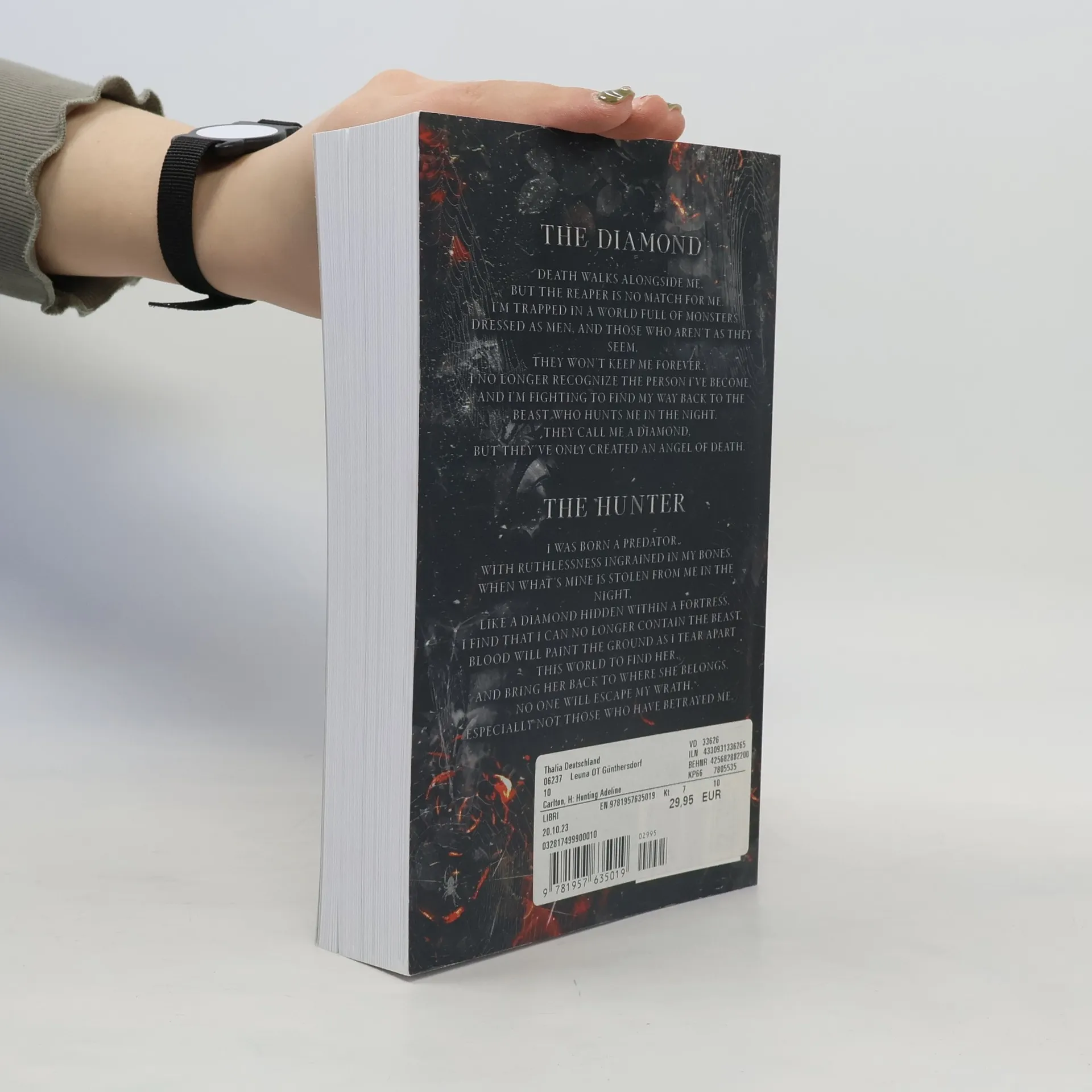 The conclusion to the Cat and Mouse Duet is here...The DiamondDeath walks alongside me,But the reaper is no match for me.I'm trapped in a world full of monsters dressed as men, and those who aren't as they seem.They won't keep me forever.I no longer recognize the person I've become,And I'm fighting to find my way back to the beast who hunts me in the night.They call me a diamond,But they've only created an angel of death.The HunterI was born a predator,With ruthlessness ingrained in my bones.When what's mine is stolen from me in the night,Like a diamond hidden within a fortress,I find that I can no longer contain the beast.Blood will paint the ground as I tear apart this world to find her.And bring her back to where she belongs.No one will escape my wrath,Especially not those who have betrayed me.Warning: This is the second and final installment to the Duet. You must read Haunting Adeline first.