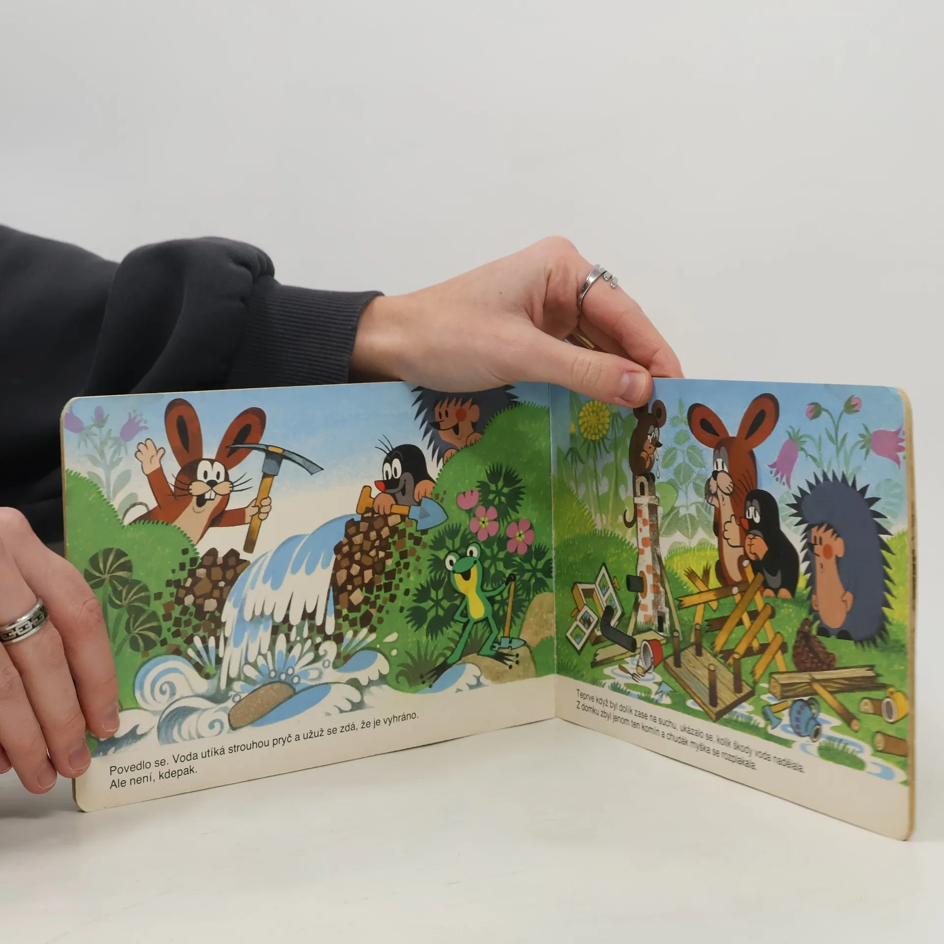 Leporelo pro děti s půvabnými ilustracemi Zdeňka Milera o krtkovi a jeho přátelích. Tento příběh vypráví o tom, jak krtek s ježkem a zajíčkem pomohli myšce přestát potopu, zachránili ji a ještě postavili nový domeček. Inu, kamarádi jak se patří.