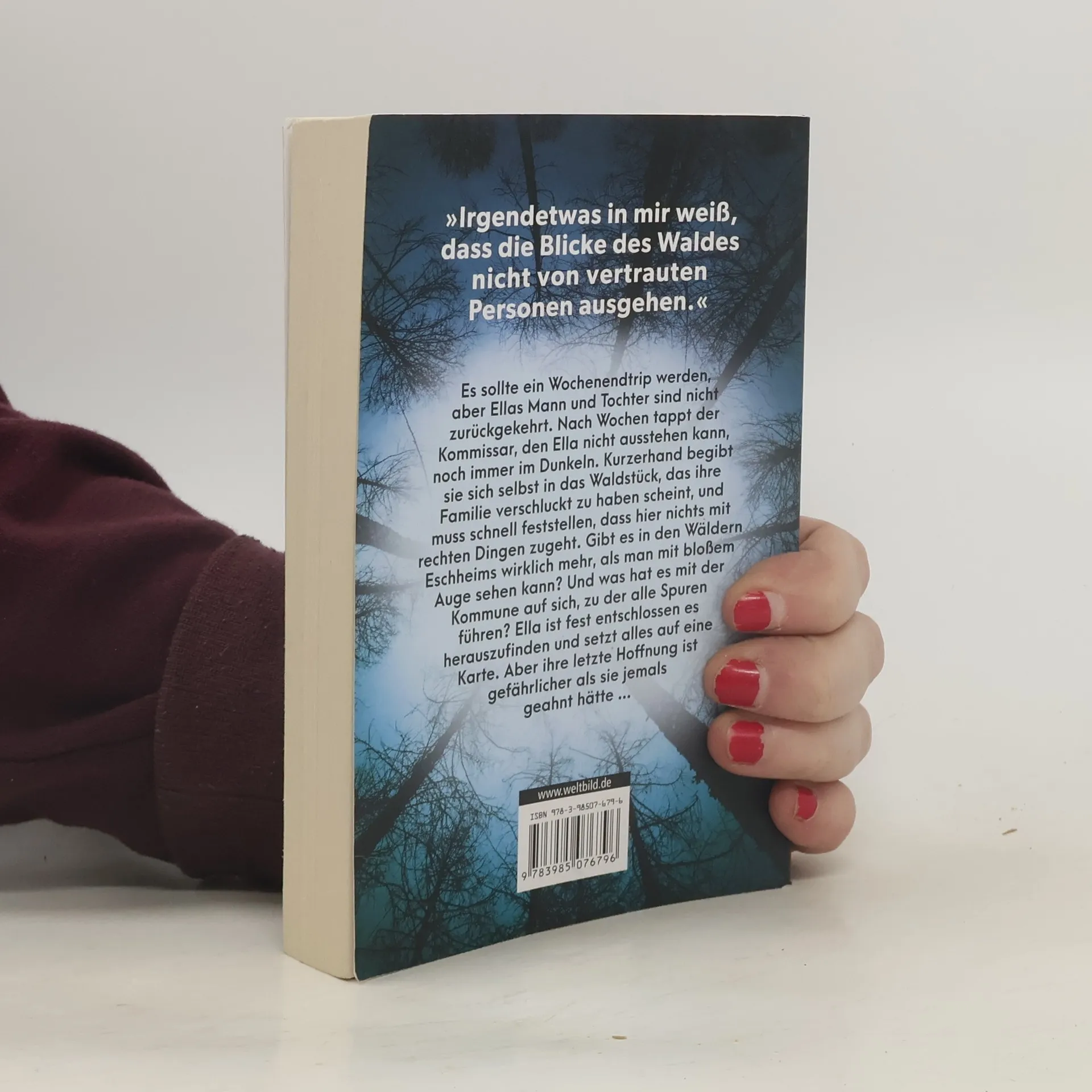 Ein beklemmender Thriller um eine Frau auf der Suche nach ihrer Familie »Irgendetwas in mir weiß, dass die Blicke des Waldes nicht von vertrauten Personen ausgehen.« Es sollte ein Wochenendtrip werden, aber Ellas Mann und Tochter sind nicht zurückgekehrt. Nach Wochen tappt der Kommissar mit der Gelfrisur, den Ella nicht ausstehen kann, noch immer im Dunkeln. Kurzerhand begibt sie sich selbst in das Waldstück, das ihre Familie verschluckt zu haben scheint, und muss schnell feststellen, dass hier nichts mit rechten Dingen zugeht. Gibt es in den Wäldern Eschheims wirklich mehr, als man mit bloßem Auge sehen kann? Und was hat es mit der Kommune auf sich, zu der alle Spuren führen? Ella ist fest entschlossen es herauszufinden und setzt alles auf eine Karte. Aber ihre letzte Hoffnung ist gefährlicher als sie jemals geahnt hätte...