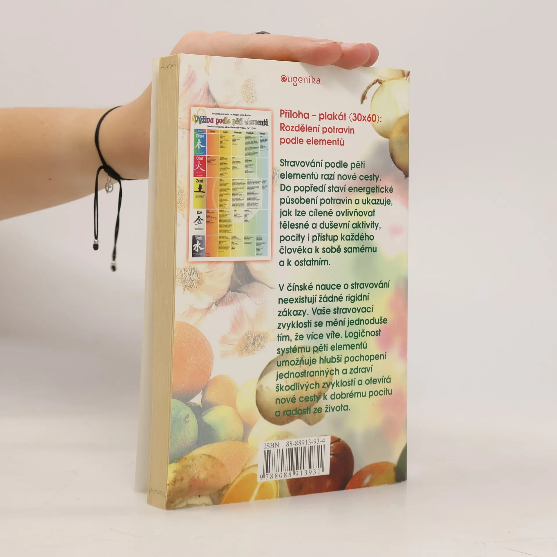 Stravování podle pěti elementů razí nové cesty. Do popředí staví energetické působení potravin a ukazuje, jak lze cíleně ovlivňovat tělesné a duševní aktivity, pocity i přístup každého člověka k sobě samému a k ostatním. V čínské nauce o stravování neexistují žádné rigidní zákazy. Vaše stravovací zvyklosti se mění jednoduše tím, že více víte. logičnost systému pěti elementů umožňuje hlubší pochopení jednostranných a zdraví škodlivých zvyklostí a otevírá nové cesty k dobrému pocitu a radosti ze života. Příloha - plakát (30x60 cm): Rozdělení potravin podle pěti elementů.