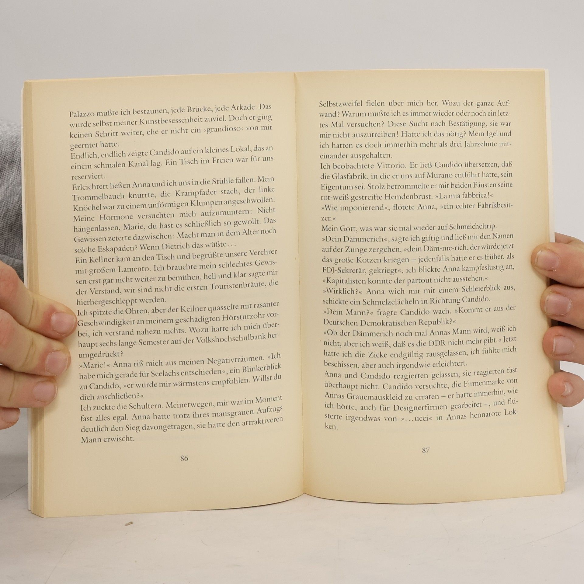 Anna und Marie hoffen aufs kleine Abenteuer in Venedig. In München kaufen sie für alle Fälle gondelschwarze Spitzenwäsche. Nach schlaflos durchlachter Nachtfahrt sitzen sie mächtig aufgepeppt und erwartungsfroh an der Rialtobrücke. Schon stehen Vittorio und Freund Candido bereit, die beiden Frauen durch Gassen und Kanäle zu locken. Doch »Traummänner küssen anders«, finden Anna und Marie. Sie trösten sich mit phantastischen Erzählungen über verflossene Lieben. An der Tür des Café Florian lehnt ein Mann - ein kurzer Blick und Marie ist hypnotisiert, doch Anna zieht sie aus dem Gefahrenbereich. Nachts sehnt sich Marie, hellwach am Fenster, nach dem Mann vom Café. Da steht er plötzlich hingezaubert unten auf dem Platz. Küssend taumeln sie zum Canal Grande... Abends auf dem Bahnhof, in grellem Neonlicht: Anna ernüchtert, Marie traumverloren. »Küß keinen am Canal Grande!« sagt Marie und kneift Anna lachend in die üppigen Hüften. »Ich erzähl dir meine neueste Geschichte, die Geschichte der letzten Nacht!«