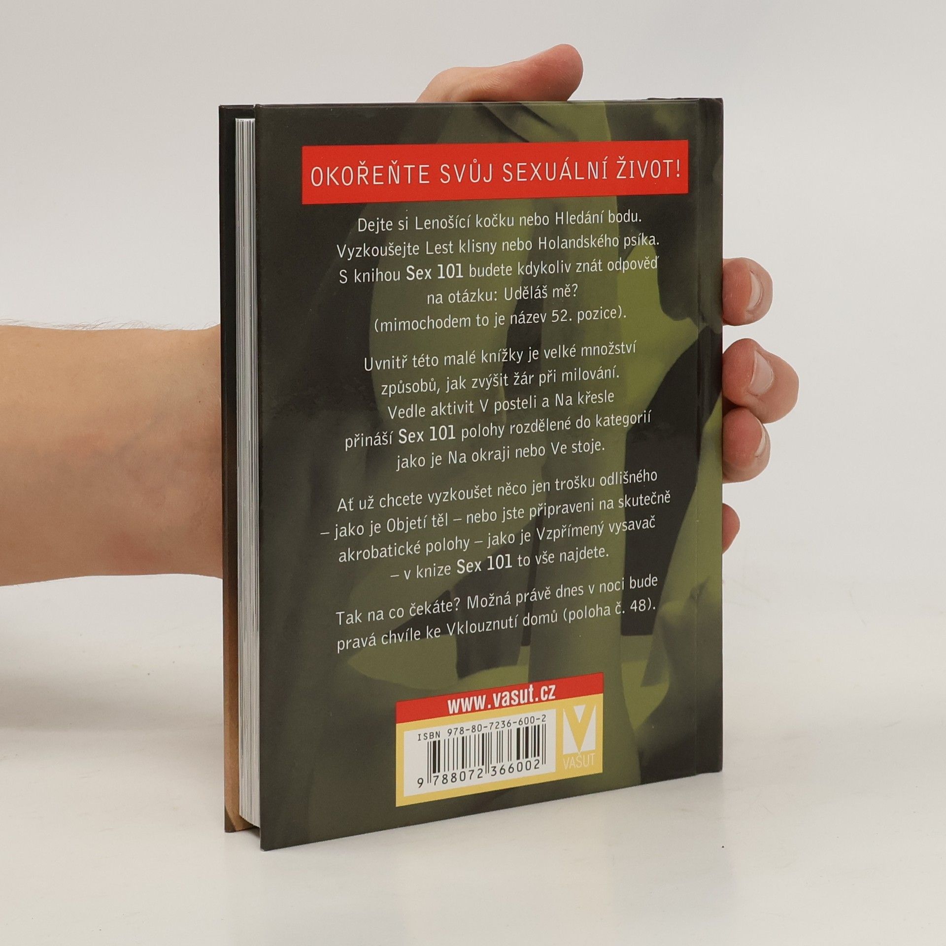 Okořeňte svůj sexuální život! Dejte si Lenošící kočku nebo Hledání bodu. Vyzkoušejte Lest klisny nebo Holandského psíka. S knihou Sex 101 budete kdykoliv znát odpověď na otázku: Uděláš mě? (mimochodem to je název 52. pozice). Uvnitř této malé knížky je velké množství způsobů, jak zvýšit žár při milování. Vedle aktivit V posteli a Na křesle přináší Sex 101 polohy rozdělené do kategorií jako je Na okraji nebo Ve stoje. Ať už chcete vyzkoušet něco jen trošku odlišného - jako je Objetí těl - nebo jste připraveni na skutečně akrobatické polohy - jako je Vzpřímený vysavač - v knize Sex 101 to vše najdete. Tak na co čekáte? Možná právě dnes v noci bude pravá chvíle ke Vklouznutí domů (poloha č. 48).