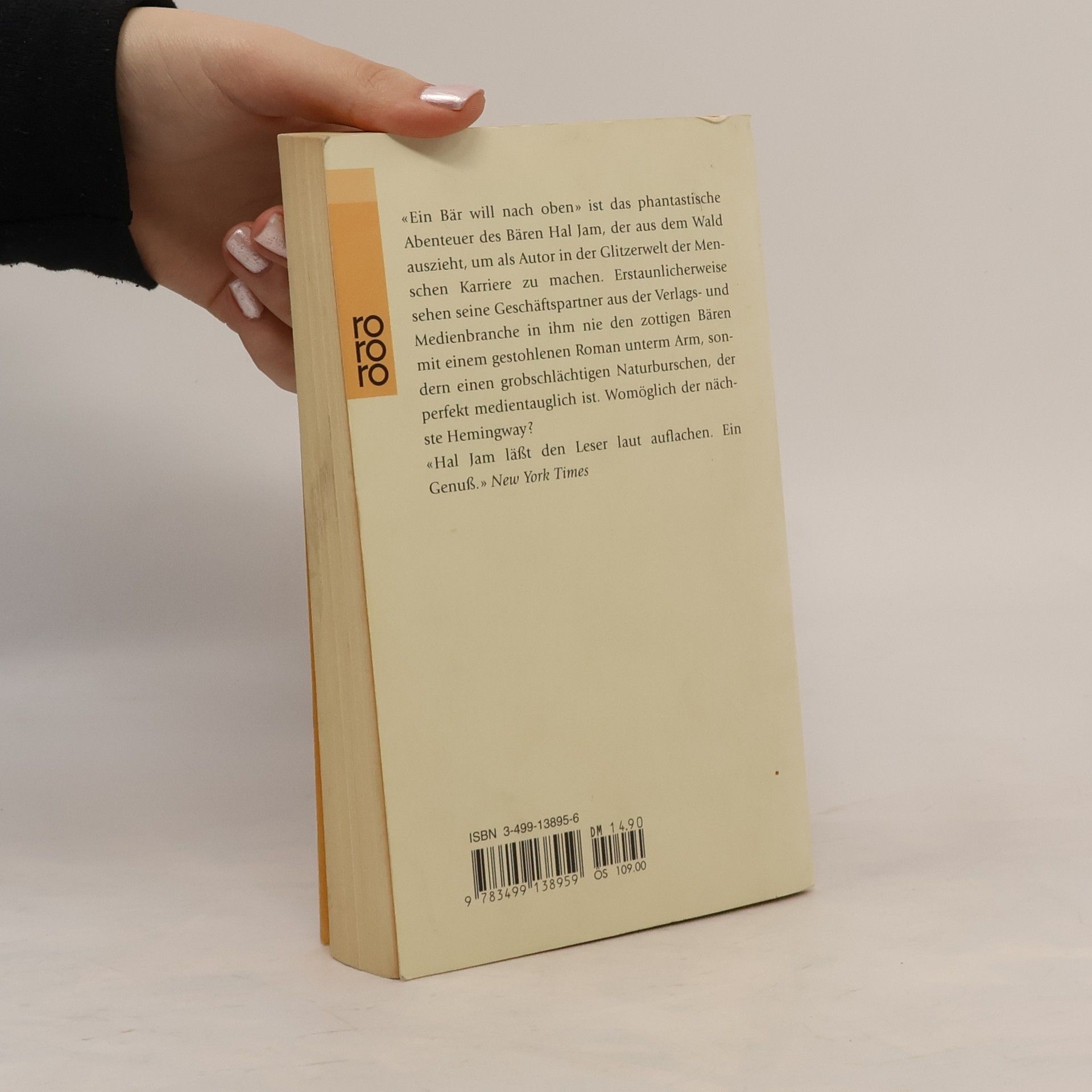 «Ein Bär will nach oben» ist das phantastische Abenteuer des Bären Hal Jam, der aus dem Wald auszieht, um als Autor in der Glitzerwelt der Menschen Karriere zu machen. Erstaunlicherweise sehen seine Geschäftspartner aus der Verlags- und Medienbranche in ihm nie den zottigen Bären mit einem gestohlenen Roman unterm Arm, sondern einen grobschlächtigen Naturburschen, der perfekt medientauglich ist. Womöglich der nächste Hemingway?